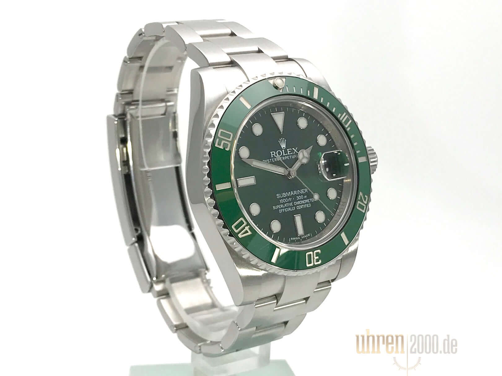 Case made of polished and satined stainless steel, case diameter 40 mm, case height 12.5 mm, stainless steel bezel with green ceramic inlay, 60 minute scale and luminous dot, rotatable, Oyster stainless steel bracelet polished and satined with safety folding clasp, green dial with applied luminous indices and luminous dots, luminous hands , automatic movement, caliber Rolex 3135 with 31 jewels, 28,800 A/h, chronometer, date display with quick adjustment and magnifying glass, sapphire crystal, screwed crown with side protection, screwed stainless steel back, water resistant up to 30 bar.