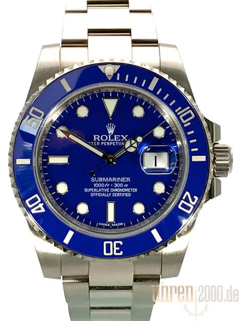 Case made of 18 kt white gold polished and satined, bezel made of white gold geared with blue Cerachrom inlay, Oyster bracelet made of 18 kt white gold polished and satined with safety folding clasp, blue dial, luminous hands, automatic, chronometer, Rolex manufacture caliber, Parachrom Breguet hairspring, date display with quick adjustment via Glass magnifier 3 o'clock, anti-reflective sapphire crystal, screwed white gold crown with side protection and Rolex logo, screwed back made of 18 kt white gold, water resistant up to 30 bar.