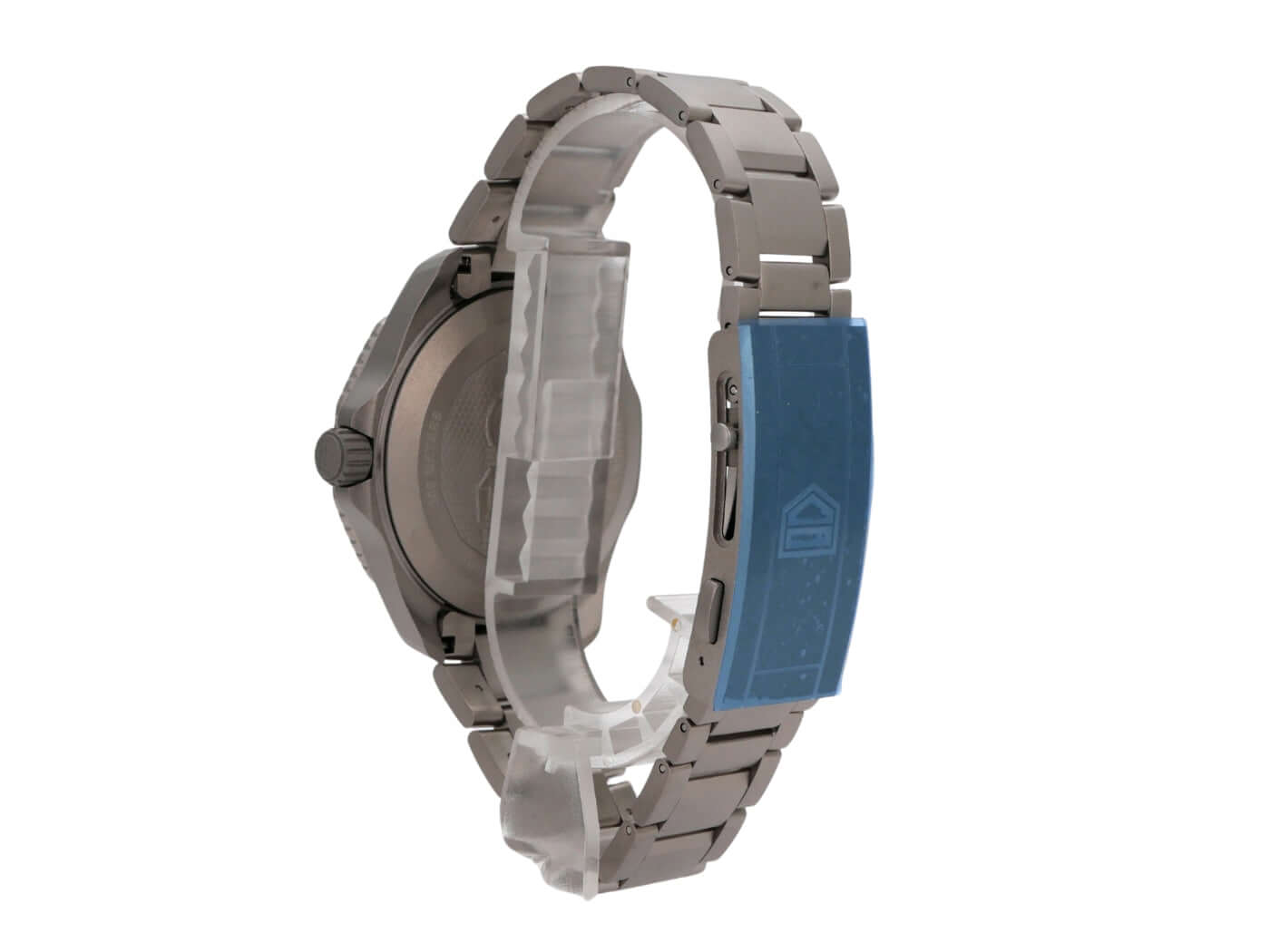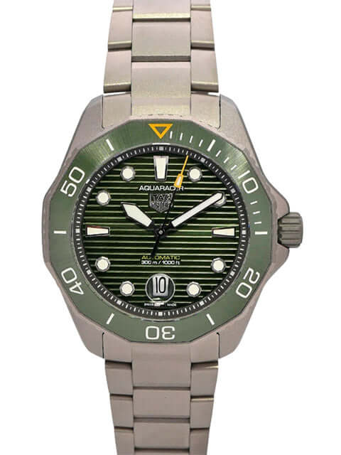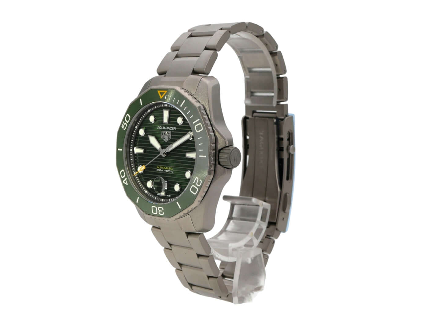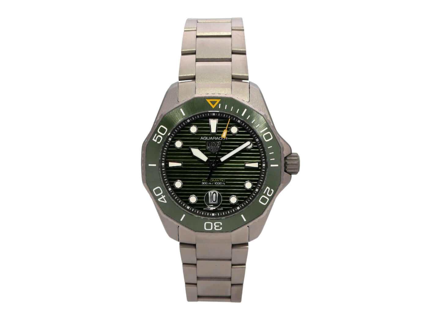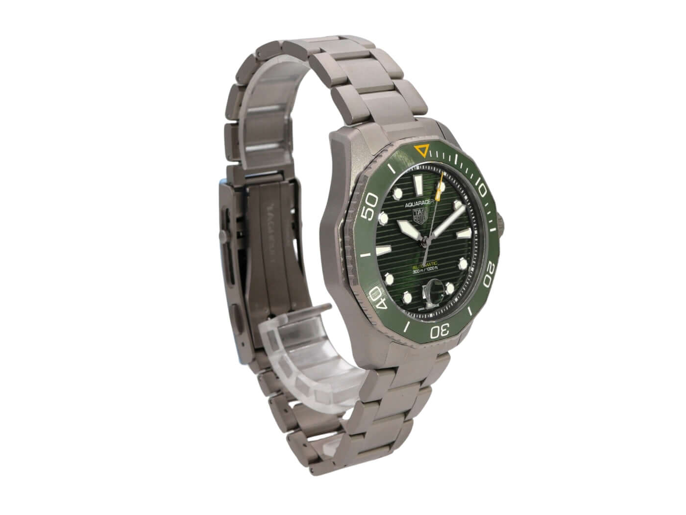 Case in polished and satin-finished titanium, case diameter 43 mm, titanium bezel with green ceramic insert, 60-minute scale with luminous dot, unidirectional rotating, satin-finished titanium bracelet with folding clasp, green dial with applied luminous indices, luminous hands, automatic movement, caliber TAG Heuer 5, date display with quick adjustment, sapphire crystal, screw-down crown with flank protection, screwed and engraved titanium case back, water-resistant up to 30 bar.
