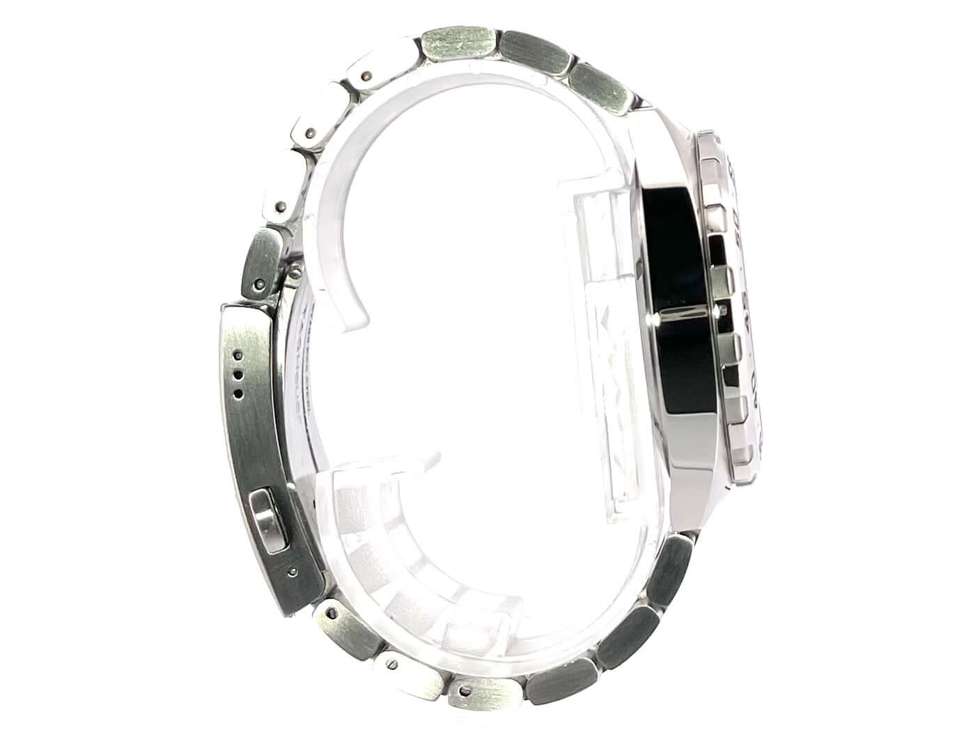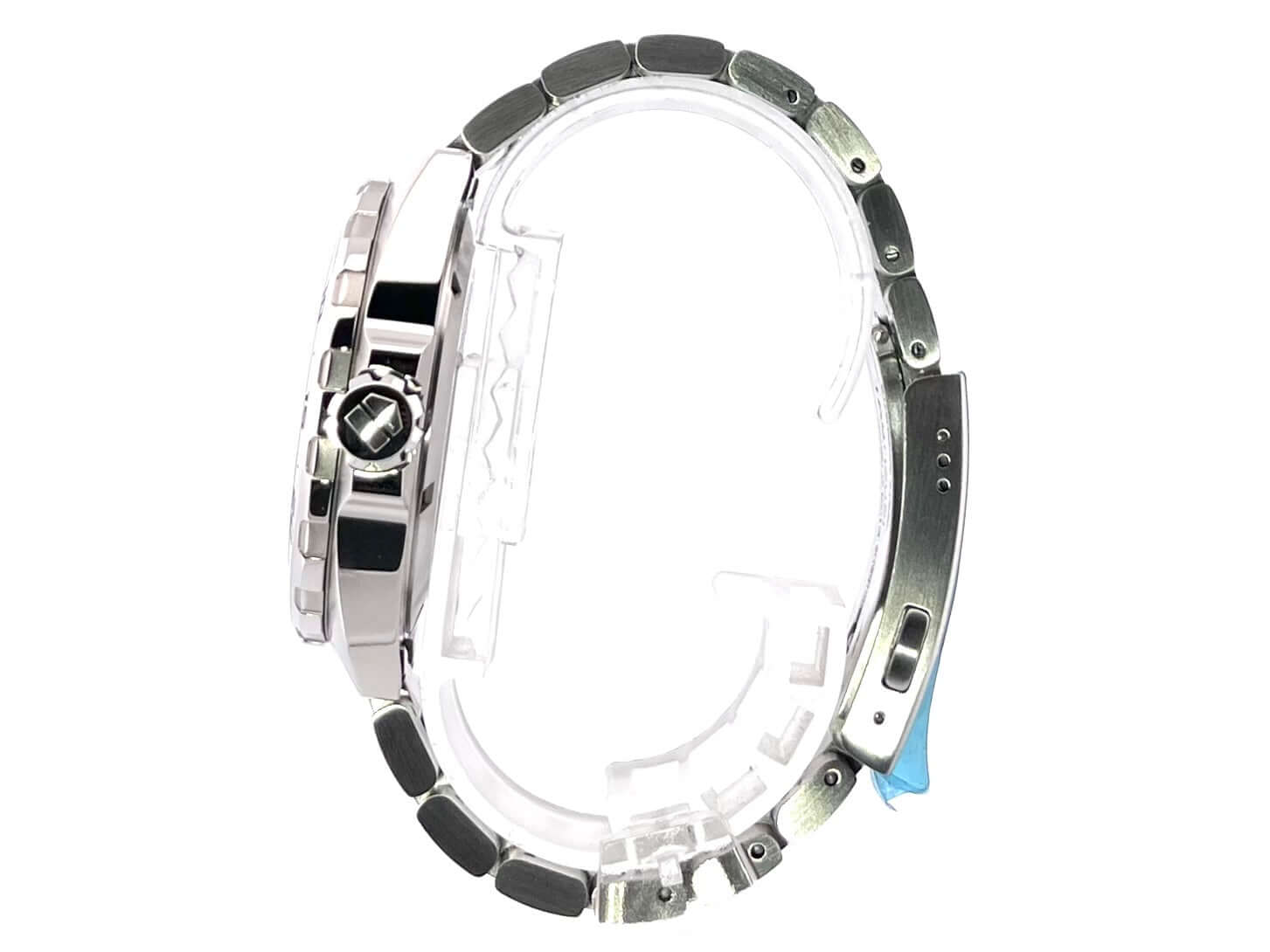Case made of satined stainless steel, case diameter 41 mm, bezel satined stainless steel, bracelet satined stainless steel with folding clasp, black dial with luminous indices, quartz movement, date display, sapphire crystal, stainless steel base, water resistant up to 20 bar.