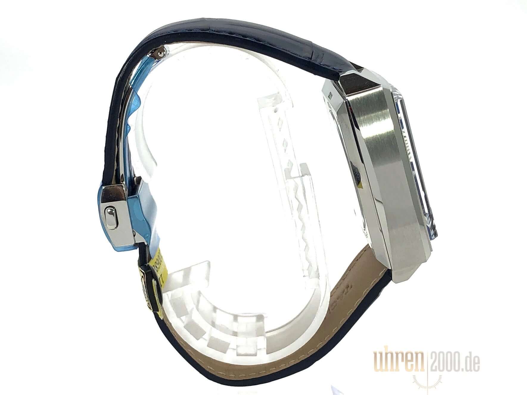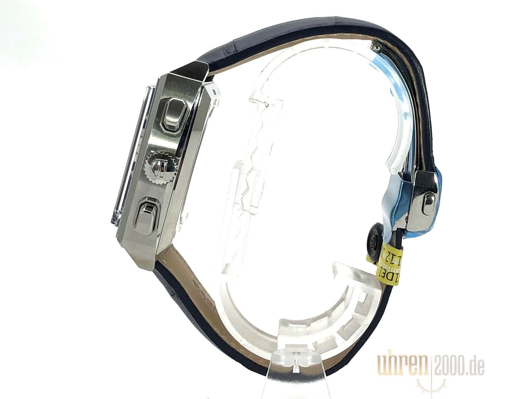Case made of polished and satin-finished stainless steel, rectangular, length 39 mm x width 39 mm, blue leather strap with folding clasp, blue dial with applied indices, luminous hands, automatic, caliber Tag Heuer 02, chronograph, date display, 80 hour power reserve, sapphire crystal, screwed stainless steel back, engraved with visible back, waterproof up to 10 bar.