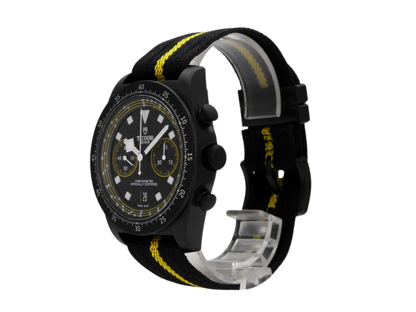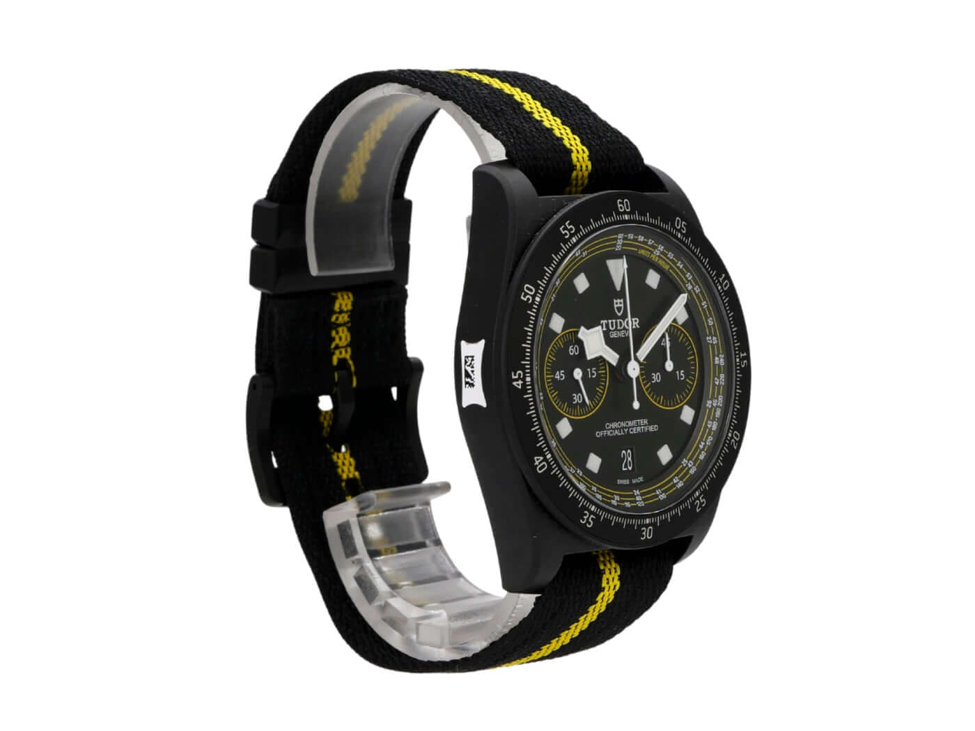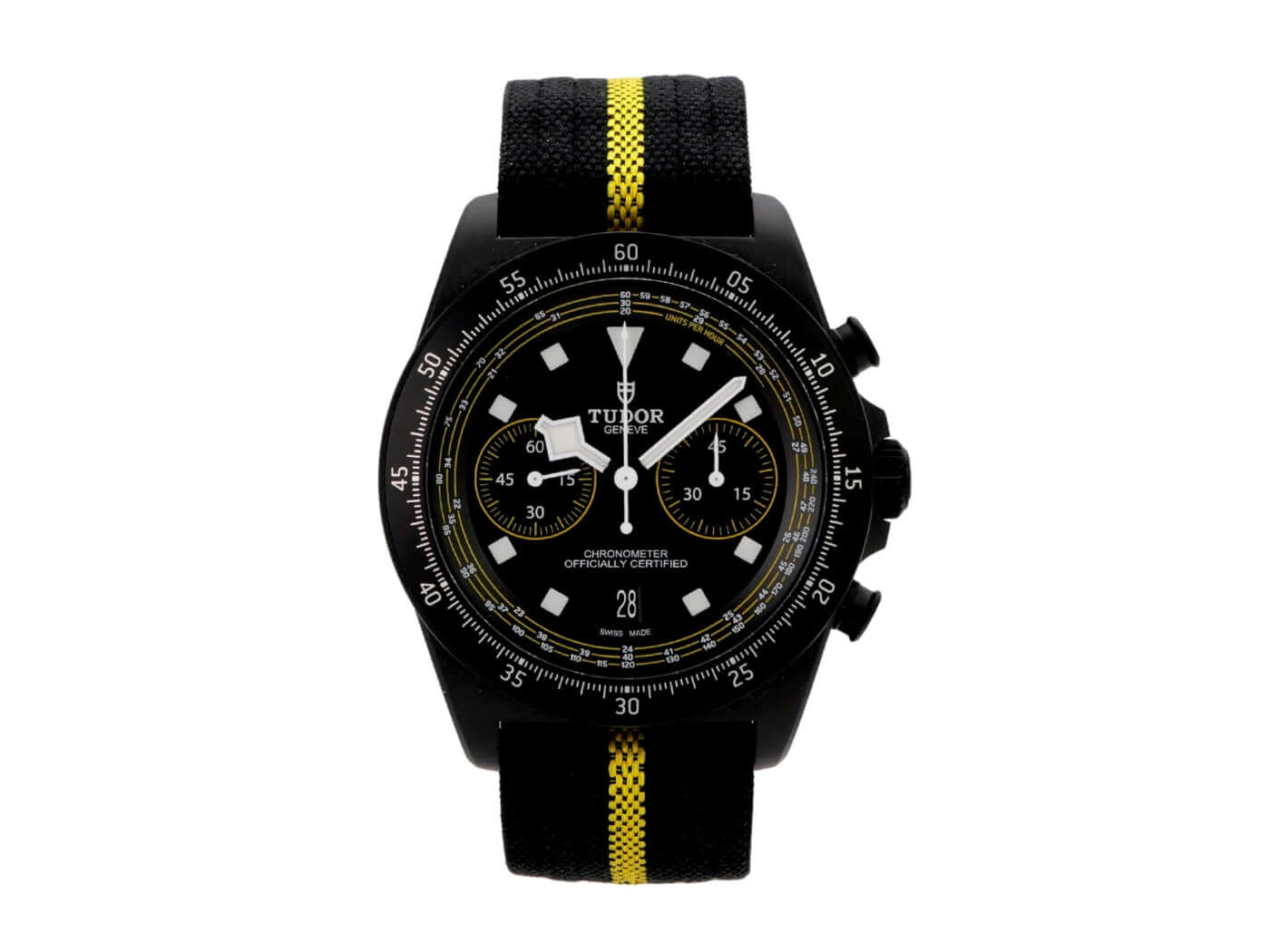 Case made of satin-finished carbon, case diameter 43 mm, case height 13.6 mm, titanium bezel with black carbon inlay, 60-minute scale with luminous dot and rotatable, black/yellow textile strap with pin buckle, black dial with applied luminous indices, luminous hands, automatic, Tudor MT5813, date, chronograph, chronometer, sapphire crystal, screw-down crown with flank protection, titanium screwed and engraved case back, water-resistant up to 10 bar, limited to 300 pieces.