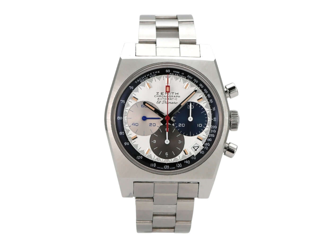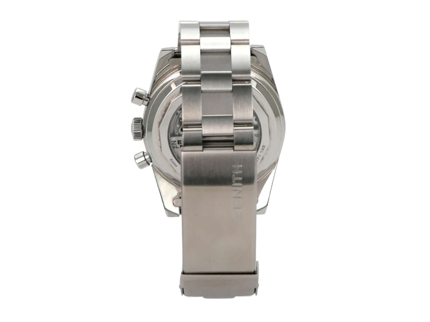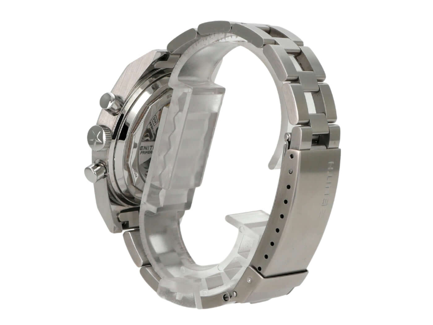 Brushed stainless steel case, case diameter 37 mm, case height 12.6 mm, polished stainless steel bezel, stainless steel bracelet with folding clasp, white dial with luminous indices, luminous hands, automatic movement, Zenith caliber El Primero 400 B, 31 jewels, 36,000 A/h, power reserve approx. 50 hours, chronograph, date, small seconds, sapphire crystal, stainless steel case back with display window, water-resistant up to 5 bar.