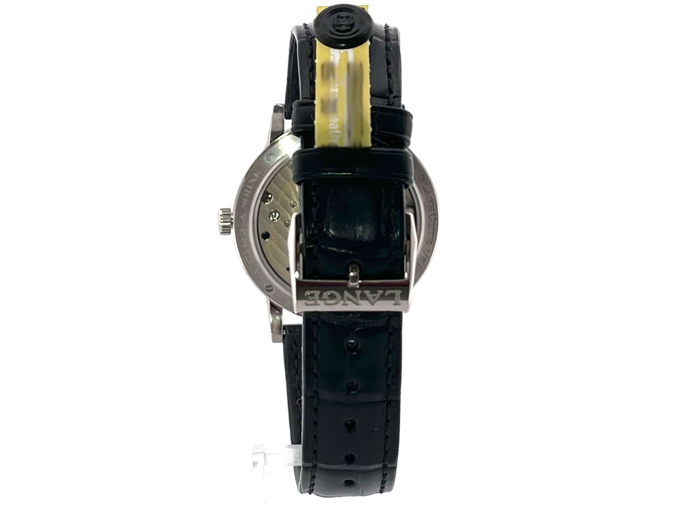 Gehäuse aus 18 kt Weißgold, Gehäusedurchmesser 39 mm, Gehäusehöhe 8,7 mm, polierte 18 kt Weißgold Lünette, schwarzes Alligatorlederband mit 18 kt Weißgold Dornschließe, Zifferblatt Massiv Silber, Handaufzug, Lange-Manufakturkaliber L051.2, Schwingung 21.600 A/h., Gangreserve 72 Stunden, Stunden, Minuten, kleine Sekunde, Gangreserveanzeige, Saphirglas, 18 kt Weißgold Boden mit Saphirglas, Wasserdicht bis zu 3 bar.
