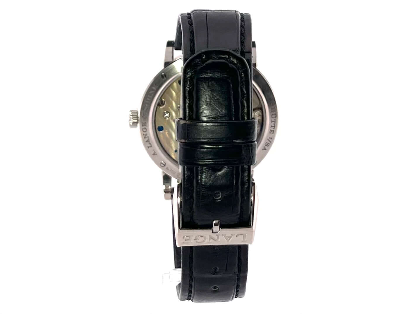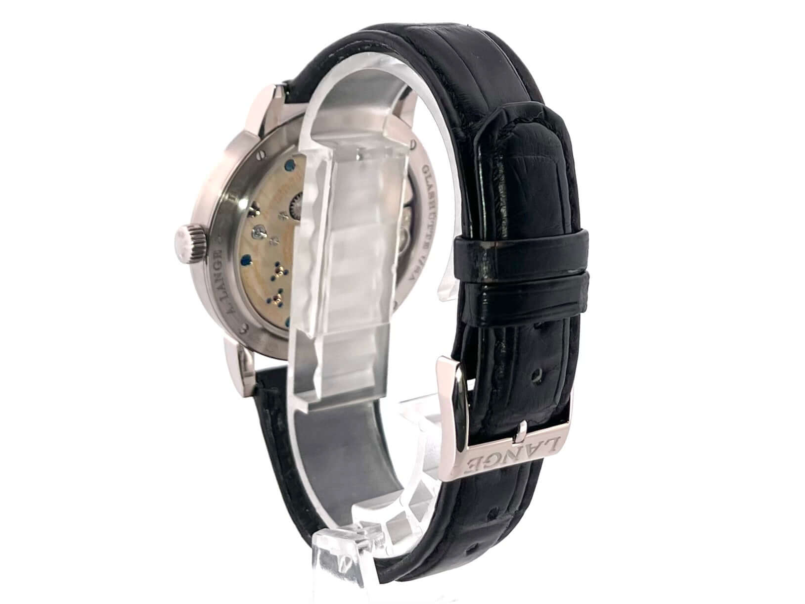 Gehäuse aus 18 kt Weißgold, Gehäusedurchmesser 39 mm, Gehäusehöhe 8,7 mm, polierte 18 kt Weißgold Lünette, schwarzes Alligatorlederband mit 18 kt Weißgold Dornschließe, Zifferblatt Massiv Silber, Handaufzug, Lange-Manufakturkaliber L051.2, Schwingung 21.600 A/h., Gangreserve 72 Stunden, Stunden, Minuten, kleine Sekunde, Gangreserveanzeige, Saphirglas, 18 kt Weißgold Boden mit Saphirglas, Wasserdicht bis zu 3 bar.