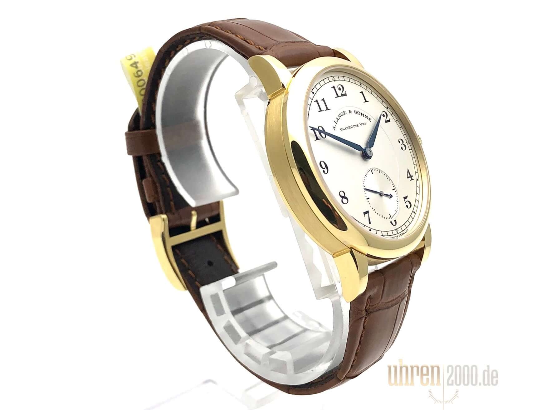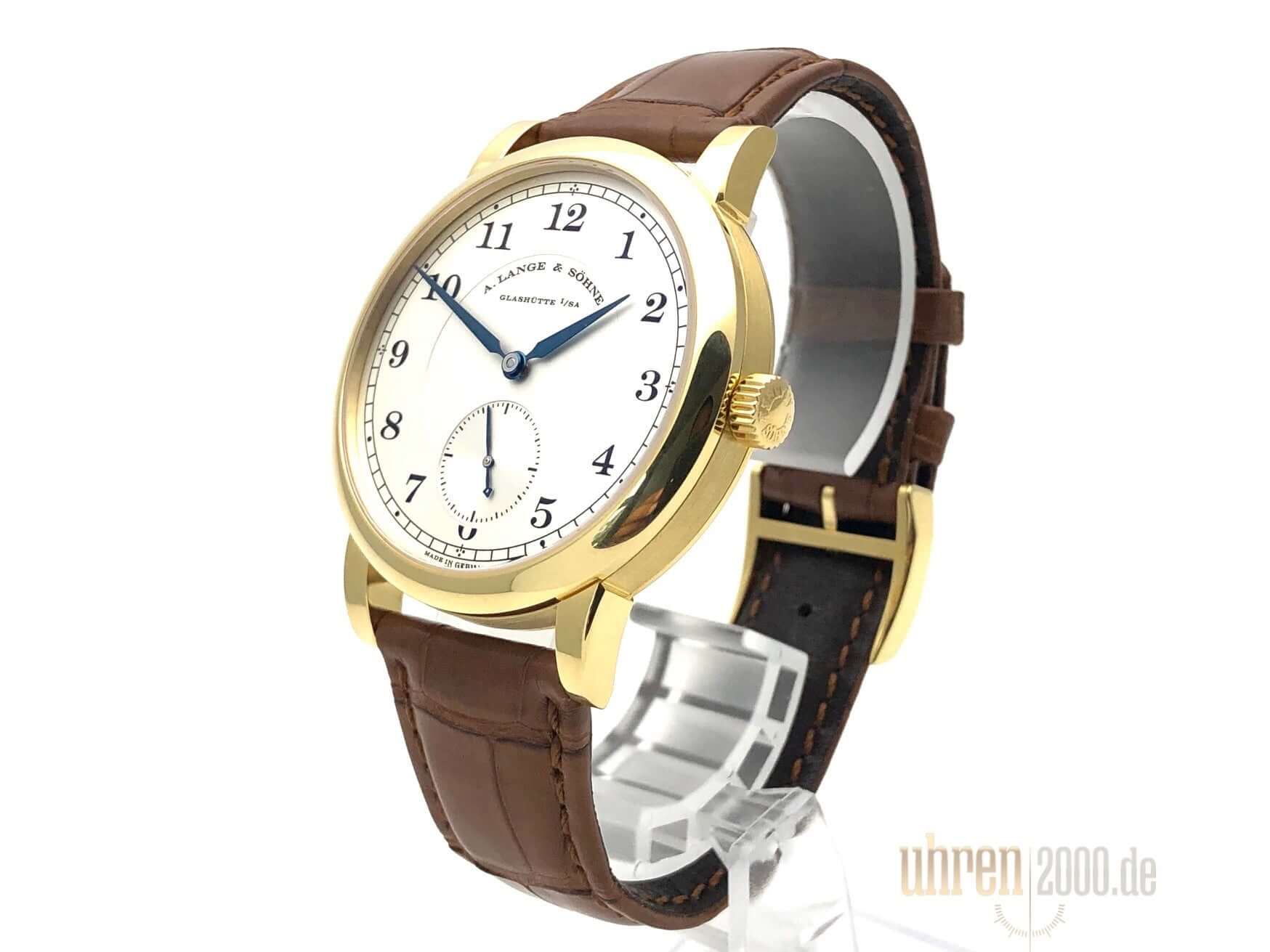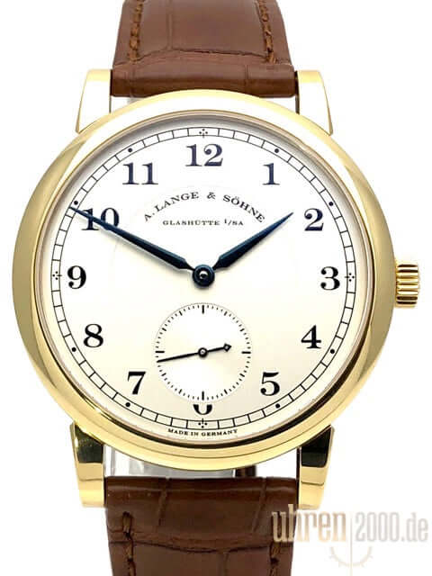 Gehäuse aus 18 kt Gelbgold, Gehäusedurchmesser 40 mm, Gehäusehöhe 8,9 mm, polierte 18 kt Gelbgold Lünette, neues braunes Alligatorlederband mit 18 kt Gelbgold Dornschließe, Zifferblatt Massiv Silber, Handaufzug, Lange-Manufakturkaliber L051.1, Schwingung 21.600 A/h., Gangreserve 55 Stunden, Stunden, Minuten, kleine Sekunde, Saphirglas, 18 kt Gelbgold Boden mit Saphirglas, Wasserdicht bis zu 3 bar.