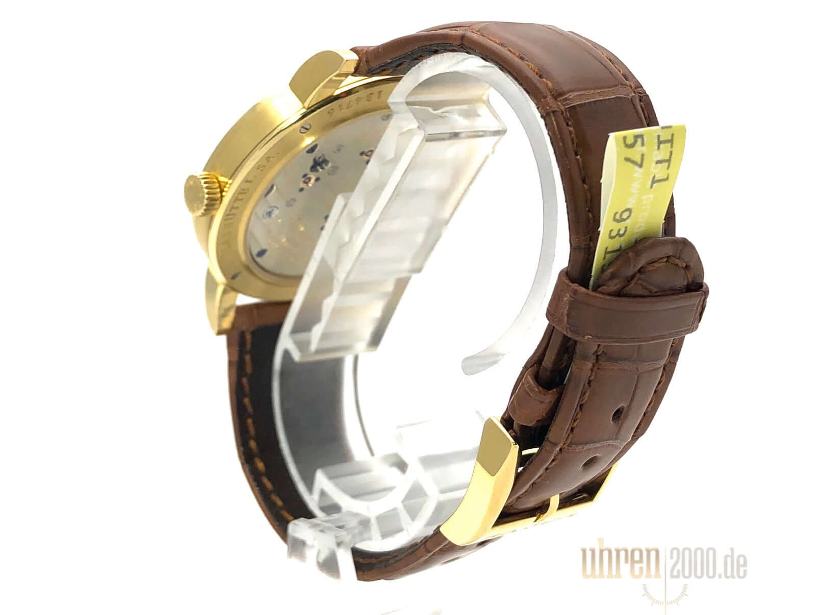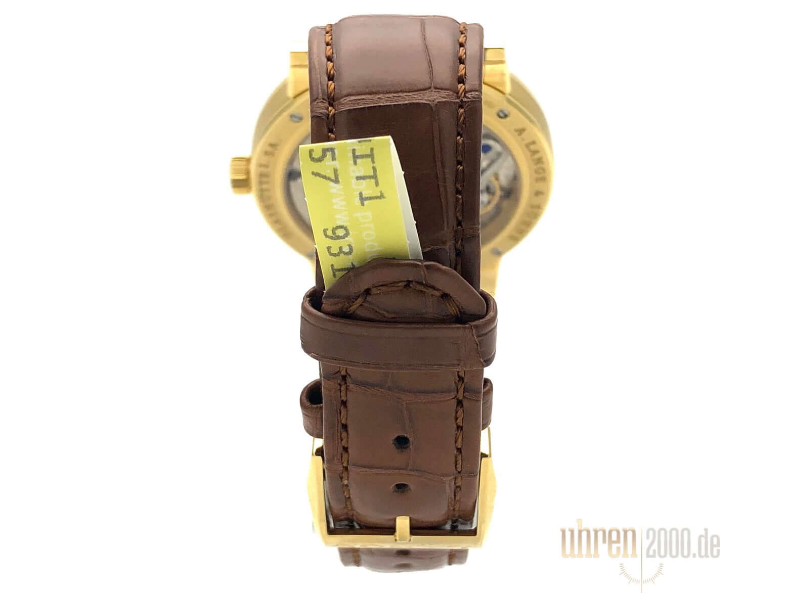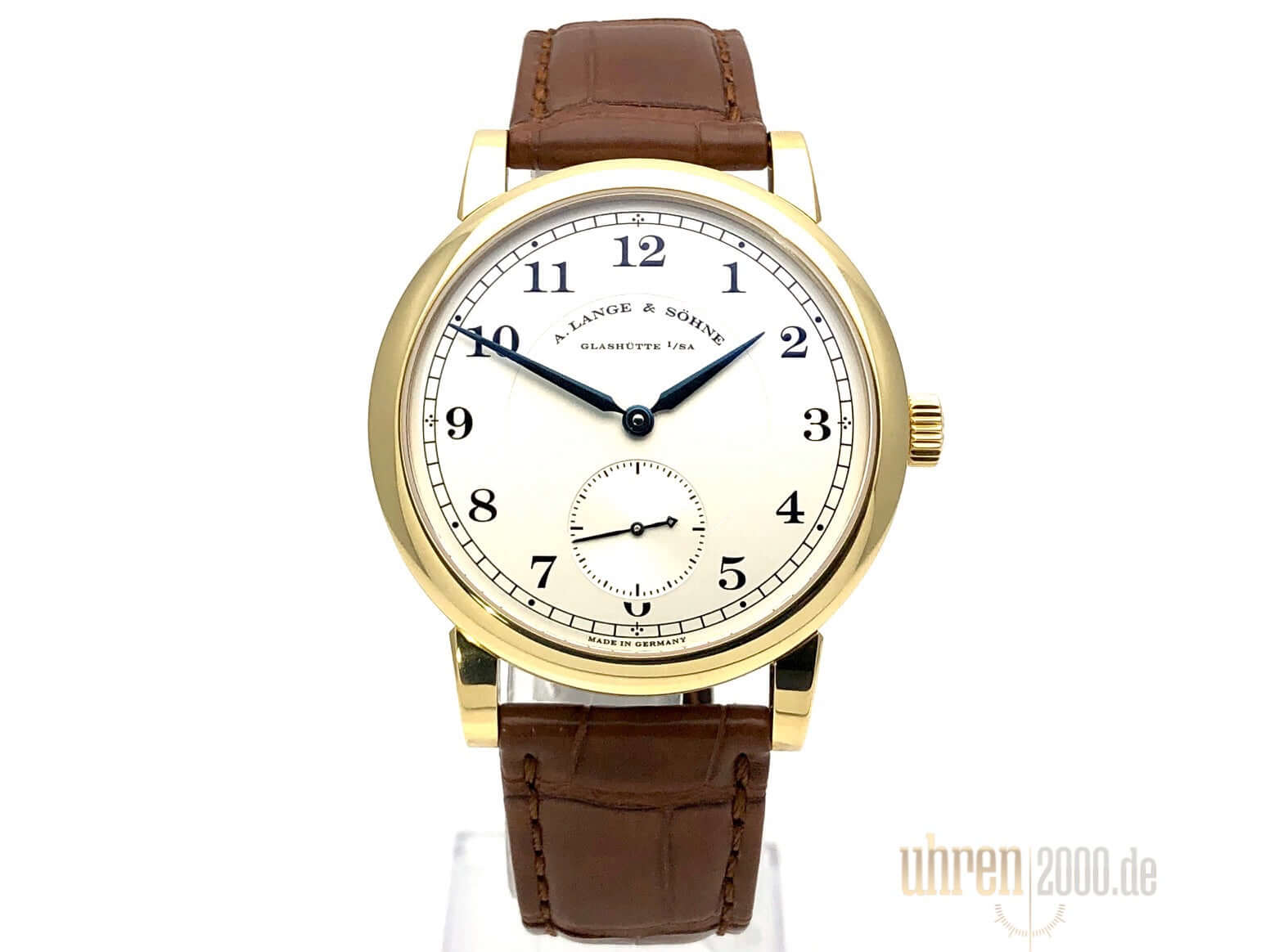 Gehäuse aus 18 kt Gelbgold, Gehäusedurchmesser 40 mm, Gehäusehöhe 8,9 mm, polierte 18 kt Gelbgold Lünette, neues braunes Alligatorlederband mit 18 kt Gelbgold Dornschließe, Zifferblatt Massiv Silber, Handaufzug, Lange-Manufakturkaliber L051.1, Schwingung 21.600 A/h., Gangreserve 55 Stunden, Stunden, Minuten, kleine Sekunde, Saphirglas, 18 kt Gelbgold Boden mit Saphirglas, Wasserdicht bis zu 3 bar.