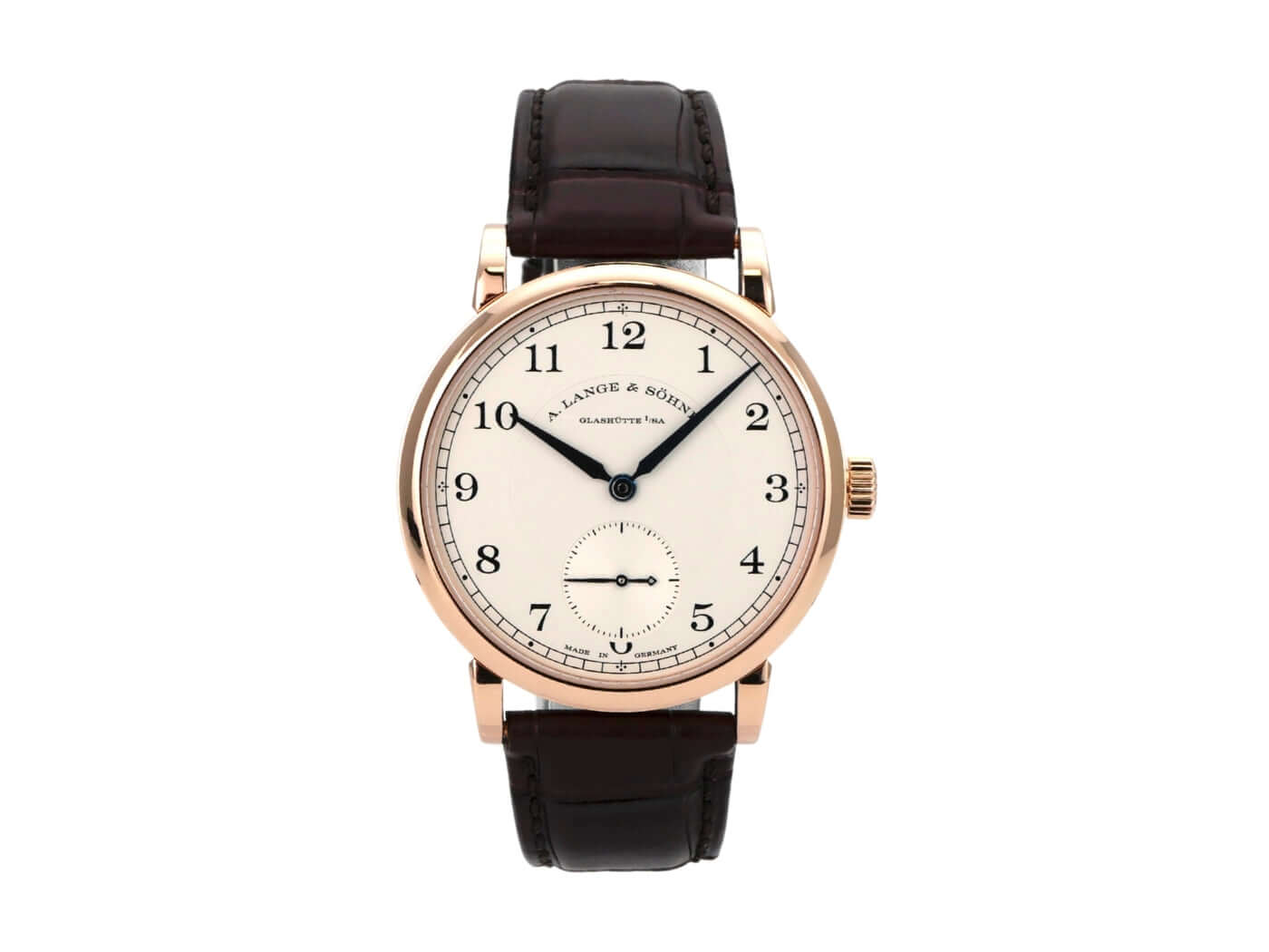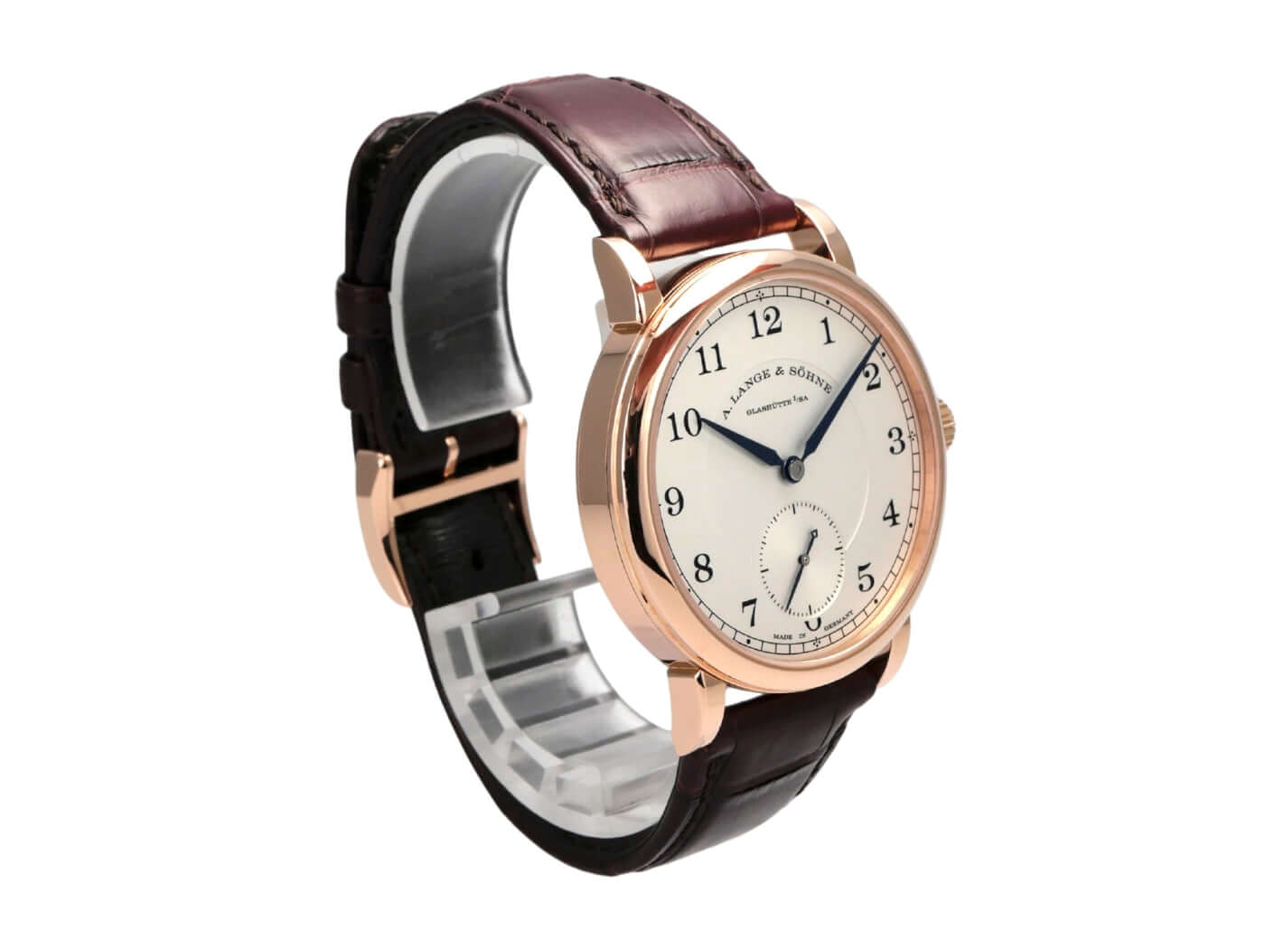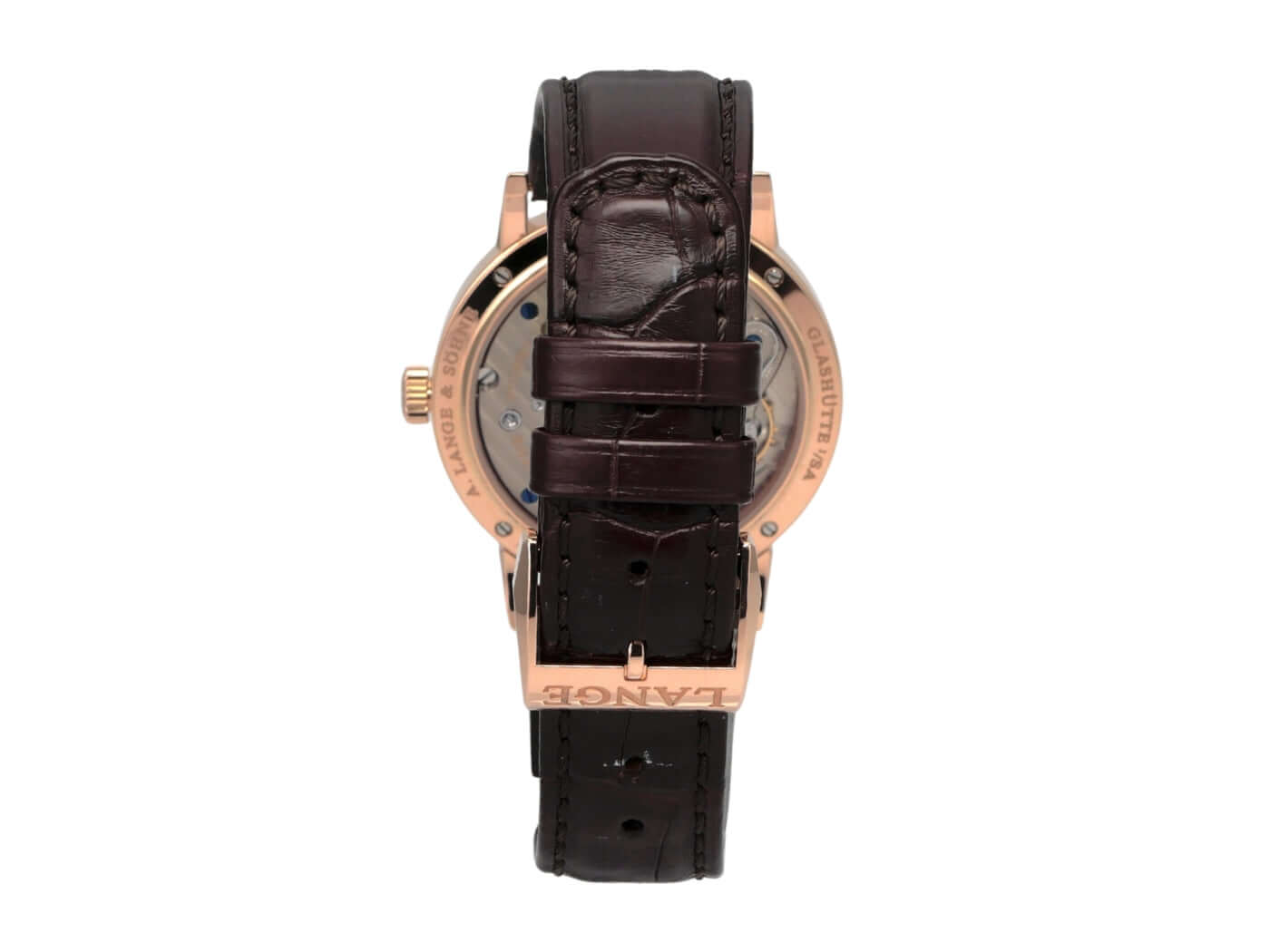 Gehäuse aus 18 kt Rotgold, Gehäusedurchmesser 38,5 mm, Gehäusehöhe 8,8 mm, polierte 18 kt Rotgold-Lünette, braunes Alligatorlederband mit 18 kt Rotgold Dornschließe, Zifferblatt Massiv Silber, Handaufzug, Lange-Manufakturkaliber L051.1, Schwingung 21.600 A/h., Gangreserve 55 Stunden, Stunden, Minuten, kleine Sekunde, Saphirglas, 18 kt Rotgold-Boden mit Saphirglas, wasserdicht bis zu 3 bar.
