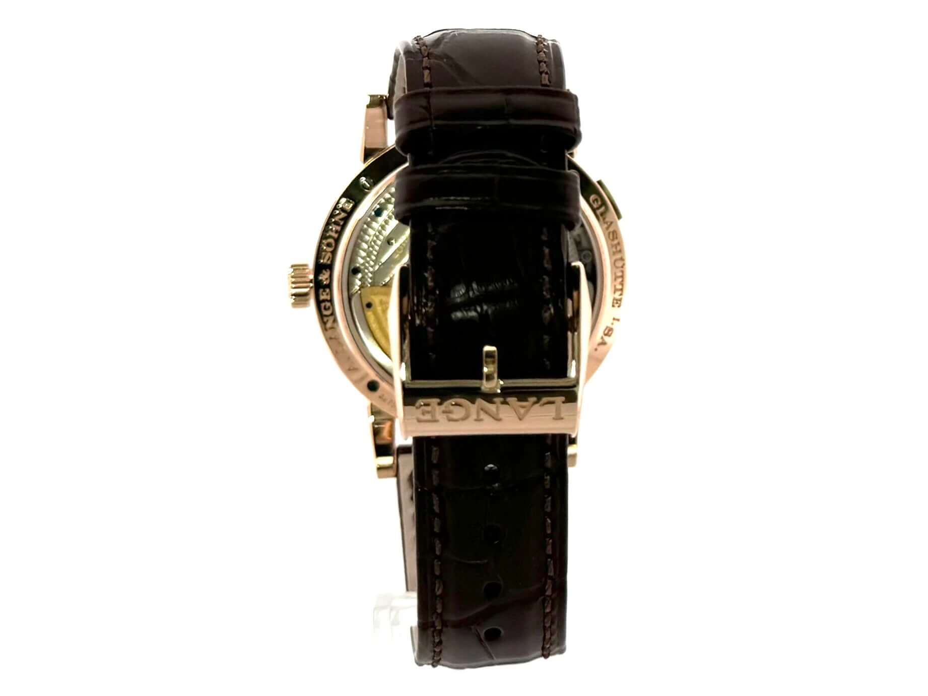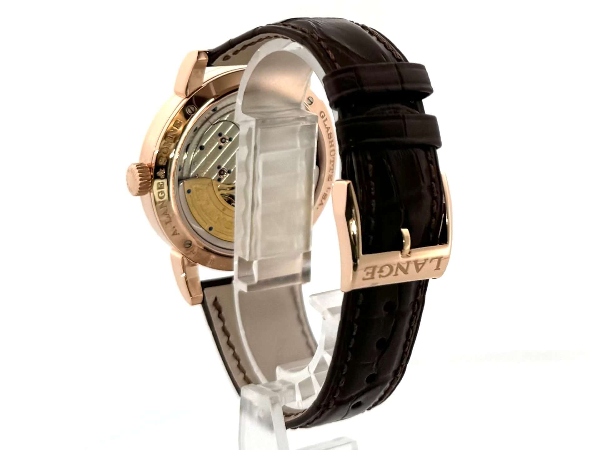 Gehäuse aus 18 kt Rotgold, Gehäusedurchmesser 39,5 mm, Gehäusehöhe 10,4 mm, Lünette aus aus 18 kt Rotgold poliert, braunes Alligatorlederband mit 18 kt Rotgold Dornschließe, Zifferblatt Silber, Automatik, Lange-Manufakturkaliber L021.1, Schwingung 21.600 A/h., Gangreserve 50 Stunden, Großdatumsanzeige, Wochentagsanzeige, kleine Sekunde, Saphirglas, 18 kt Rotgold Boden mit Saphirglas, Wasserdicht bis zu 3 bar.