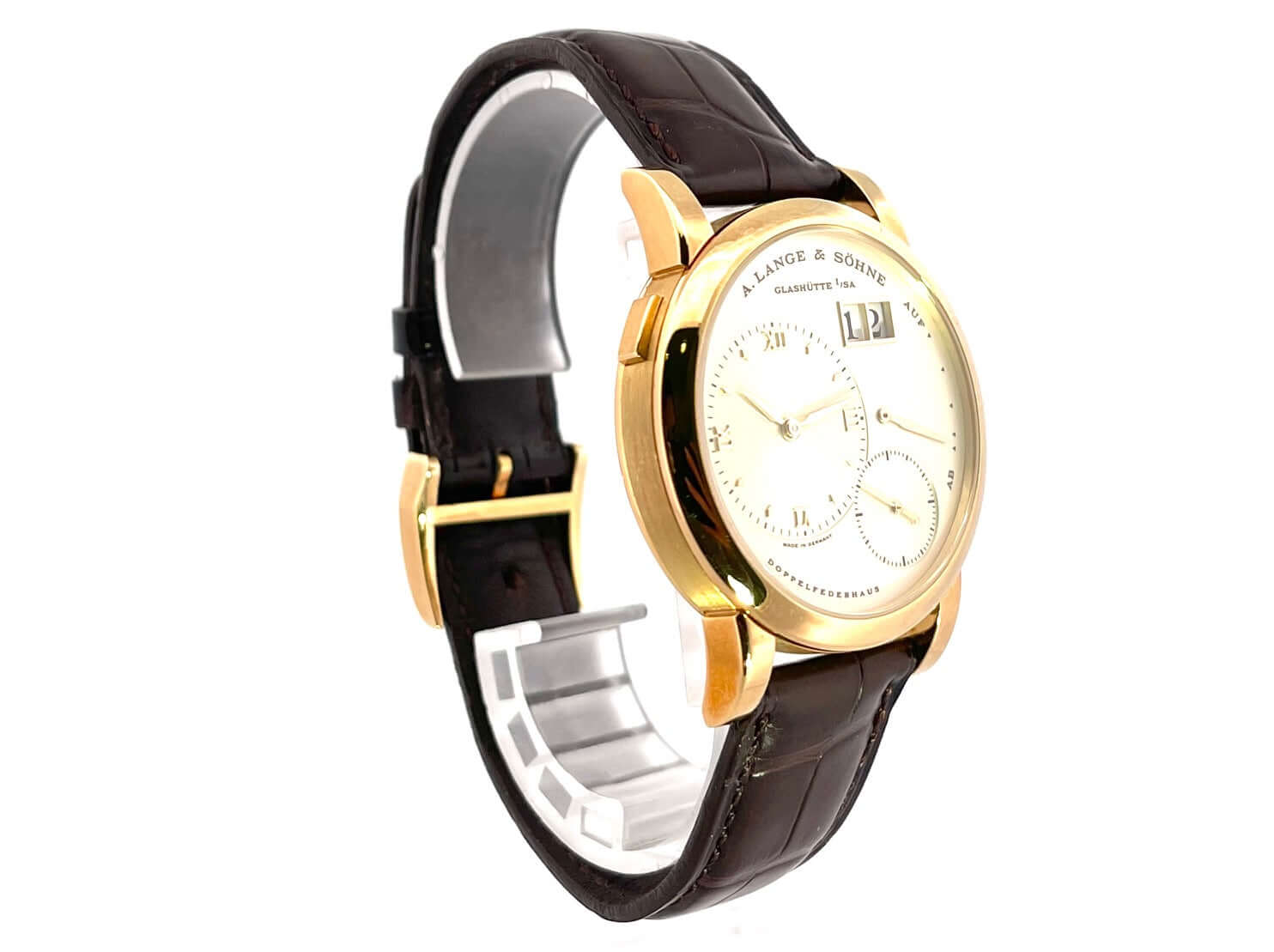 Gehäuse aus 18 kt Gelbgold, Gehäusedurchmesser 38,5 mm, Gehäusehöhe 10 mm, polierte 18 kt Gelbgold Lünette, braunes Alligatorlederband mit 18 kt Gelbgold Dornschließe, Massiv Silber Zifferblatt, Handaufzug, Lange-Manufakturkaliber L901.0, Schwingung 21.600 A/h., Gangreserve 72 Stunden, Datum, kleine Sekunde, Gangreserveanzeige, Saphirglas, 18 kt Gelbgold Boden mit Saphirglas, Wasserdicht bis zu 3 bar.