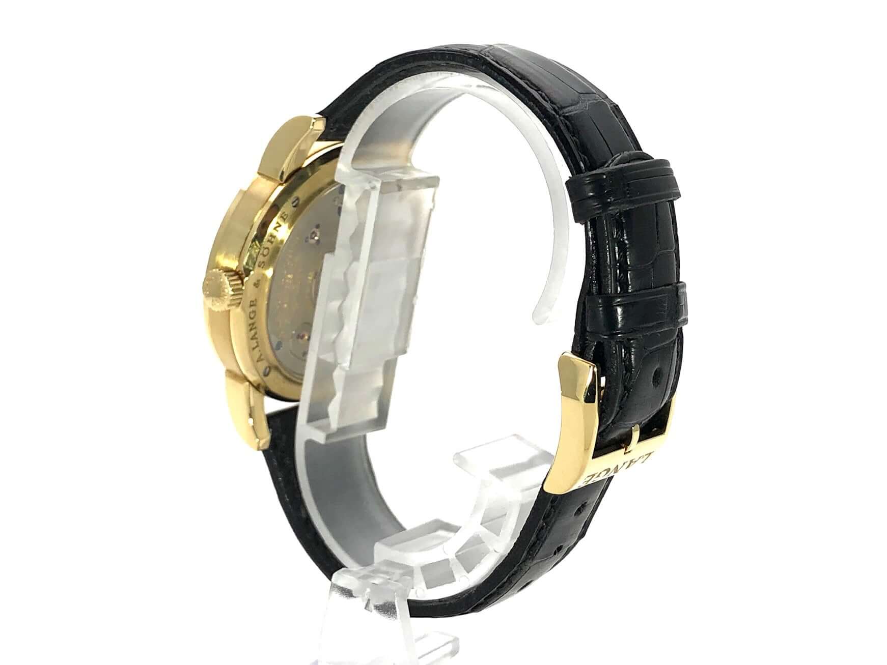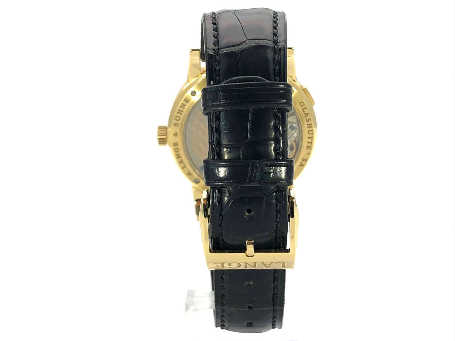 Gehäuse aus 18 kt Gelbgold, Gehäusedurchmesser 38,5 mm, Gehäusehöhe 10 mm, polierte 18 kt Gelbgold Lünette, schwarzes Alligatorlederband mit 18 kt Gelbgold Dornschließe, Massiv Silber Zifferblatt, Handaufzug, Lange-Manufakturkaliber L901.0, Schwingung 21.600 A/h., Gangreserve 72 Stunden, Datum, kleine Sekunde, Gangreserveanzeige, Saphirglas, 18 kt Gelbgold Boden mit Saphirglas, Wasserdicht bis zu 3 bar.