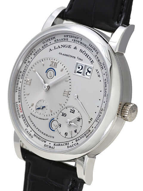 Gehäuse aus Platin, Gehäusedurchmesser 41,9 mm, Gehäusehöhe 11 mm, polierte Platin Lünette, schwarzes Alligatorlederband mit Platin Dornschließe, Zifferblatt Massiv Silber, Handaufzug, Lange-Manufakturkaliber L031.1, Schwingung 21.600 A/h., Gangreserve 72 Stunden, Stunden, Minuten, kleine Sekunde, Großdatumsanzeige, GMT/Zweite Zeitzone, Saphirglas, Platin Boden mit Saphirglas, Wasserdicht bis zu 3 bar.