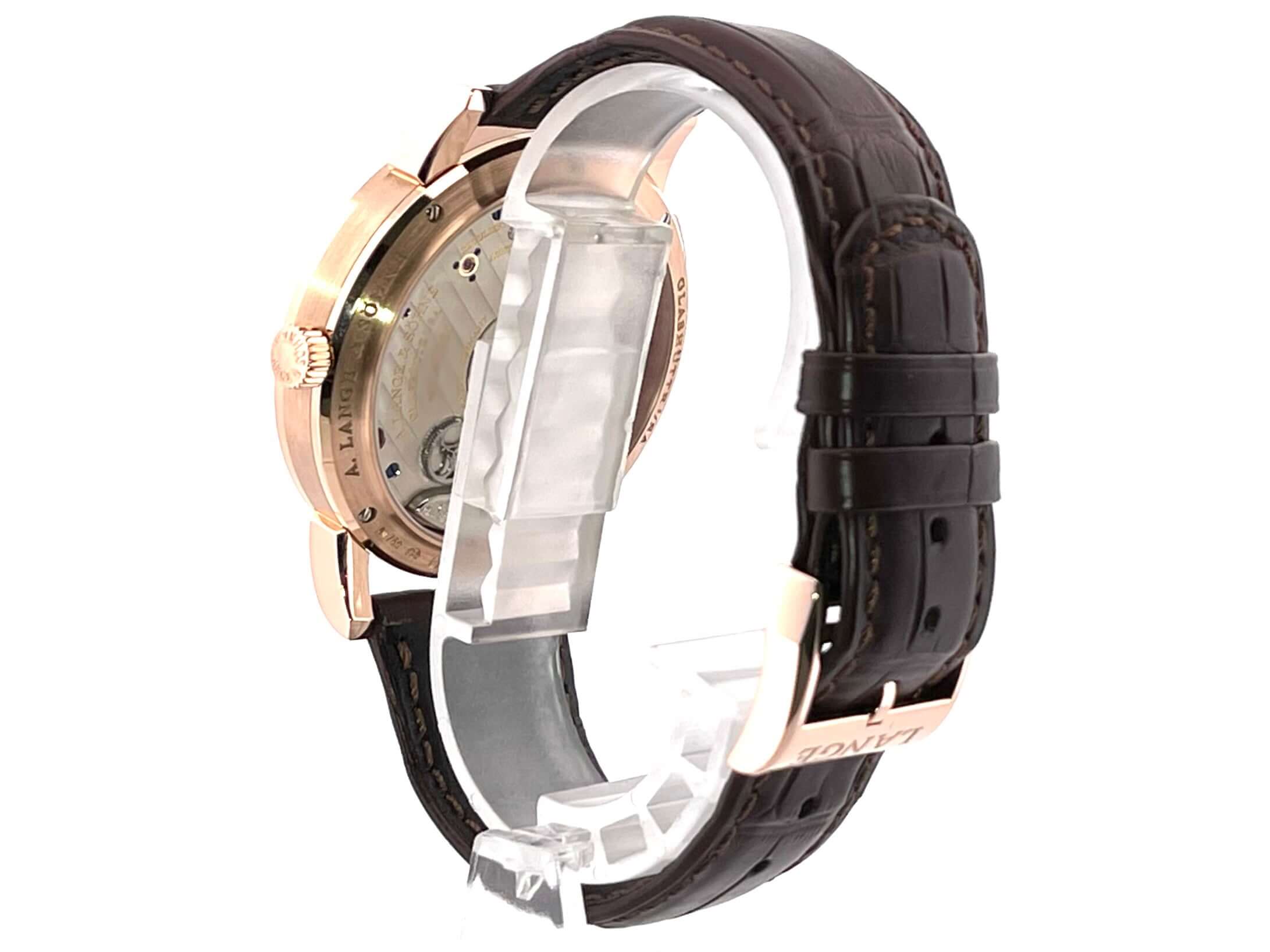 Gehäuse aus 18 kt Rotgold, Gehäusedurchmesser 41,9 mm, Gehäusehöhe 10,9 mm, Lünette aus 18 kt Rotgold poliert, braunes Alligatorlederband mit 18 kt Rotgold Dornschließe, Zifferblatt Massiv Silber, Handaufzug, Lange-Manufakturkaliber L141.1, Schwingung 21.600 A/h., Gangreserve 72 Stunden, Stunden, Minuten, kleine Sekunde, Großdatumsanzeige, GMT/Zweite Zeitzone, Saphirglas, 18 kt Rotgold Boden mit Saphirglas, Wasserdicht bis zu 3 bar.