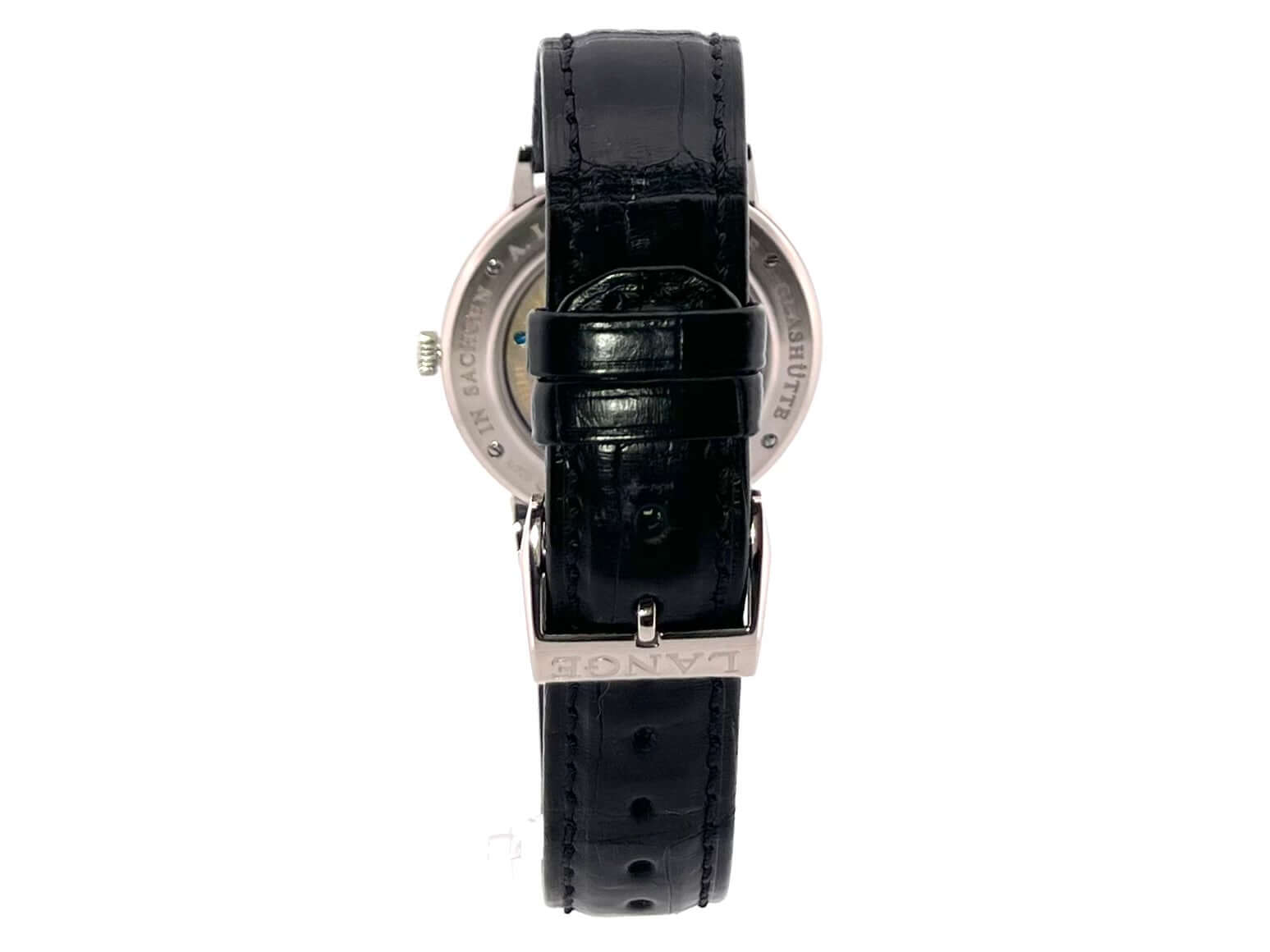 Gehäuse aus 18 kt Weißgold, Gehäusedurchmesser 37 mm, Gehäusehöhe 7,7 mm, polierte 18 kt Weißgold Lünette, schwarzes Alligatorlederband mit 18 kt Weißgold Dornschließe, Zifferblatt Massiv Silber, Handaufzug, Lange-Manufakturkaliber L941.1, Schwingung 21.600 A/h., Gangreserve 45 Stunden, Saphirglas, 18 kt Weißgold Boden mit Saphirglas, Wasserdicht bis zu 3 bar.