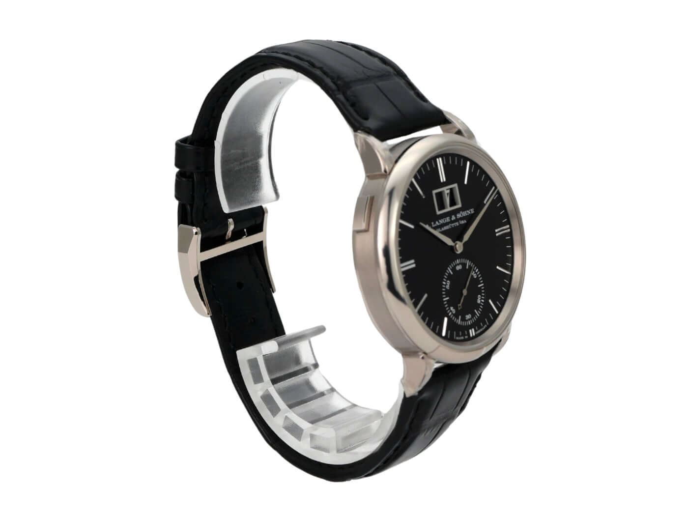 Gehäuse aus 18 kt Weißgold, Gehäusedurchmesser 38,5 mm, Gehäusehöhe 9,6 mm, polierte 18 kt Weißgold-Lünette, schwarzes Alligatorlederband mit 18 kt Weißgold Dornschließe, schwarzes Zifferblatt, Automatik, Lange-Manufakturkaliber L086.8, Schwingung 21.600 A/h., Gangreserve 72 Stunden, Großdatum, kleine Sekunde, Saphirglas, 18 kt Weißgold-Boden mit Saphirglas, wasserdicht bis zu 3 bar.