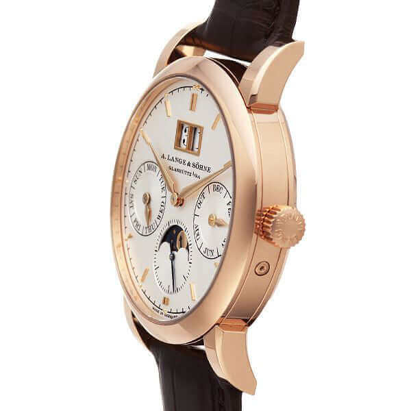 Gehäuse aus 18 kt Rotgold, Gehäusedurchmesser 38,5 mm, Gehäusehöhe 9,8 mm, polierte 18 kt Rotgold Lünette, braunes Alligatorlederband mit 18 kt Rotgold Dornschließe, Zifferblatt Massiv Silber, Automatikaufzug, Lange-Manufakturkaliber L085.1 SAX-0-MAT, Schwingung 21.600 A/h., Gangreserve 48 Stunden, Stunden, Minuten, kleine Sekunde, Datum, Wochentag, Monat, Mondphase, Jahreskalender, Saphirglas, 18 kt Rotgold Boden mit Saphirglas, Wasserdicht bis zu 3 bar.