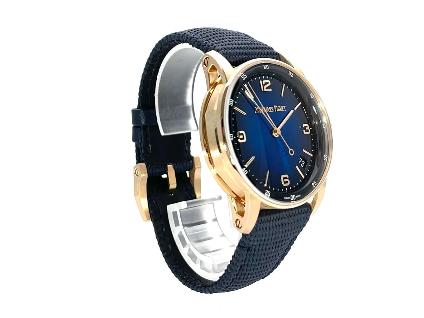 Gehäuse aus 18 kt Roségold poliert und satiniert, Gehäusedurchmesser 41 mm, Gehäusehöhe 10,7 mm, 18 kt Roségold Lünette poliert und satiniert, blaues Textilband mit 18 kt Roségold Dornschließe, blaues Zifferblatt, Automatikwerk, AP Manufakturkaliber 4302 mit 32 Steine, Schwingung 28.800 A/h, Gangreserve für ca. 70 Stunden, Datumsanzeige, kratzfestes Saphirglas, verschraubter Sichtboden, Wasserdicht bis zu 3 bar.