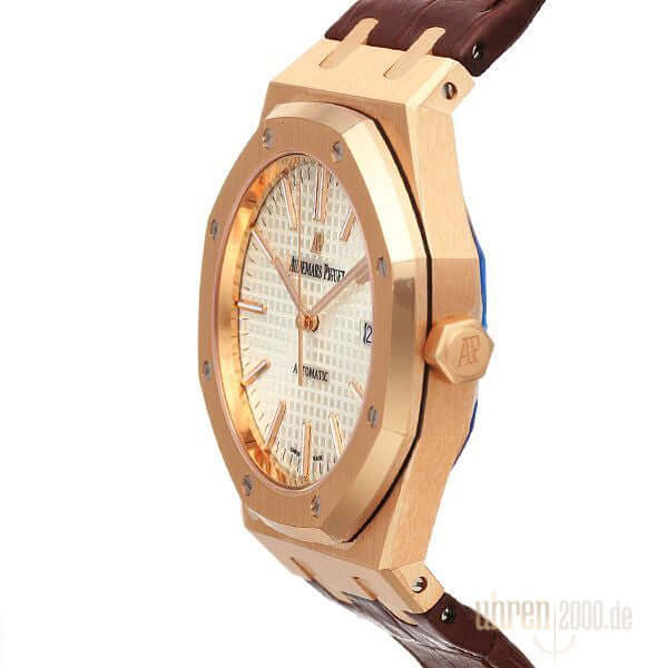 Gehäuse aus 18 kt Roségold poliert und satiniert, Gehäusedurchmesser 41 mm, Gehäusehöhe 9,8 mm, 18 kt Roségold Lünette poliert und satiniert, braunes Krokodilleder Armband mit 18 kt Roségold Faltschließe, silberfarbenes Zifferblatt mit aufgesetzten Leuchtindexen, Automatikwerk, AP Manufakturkaliber 3120 mit 40 Steine, Schwingung 21.600 A/h, Gangreserve für ca. 60 Stunden, kratzfestes Saphirglas, Datumsanzeige, verschraubter Sichtboden, Wasserdicht bis zu 5 bar.