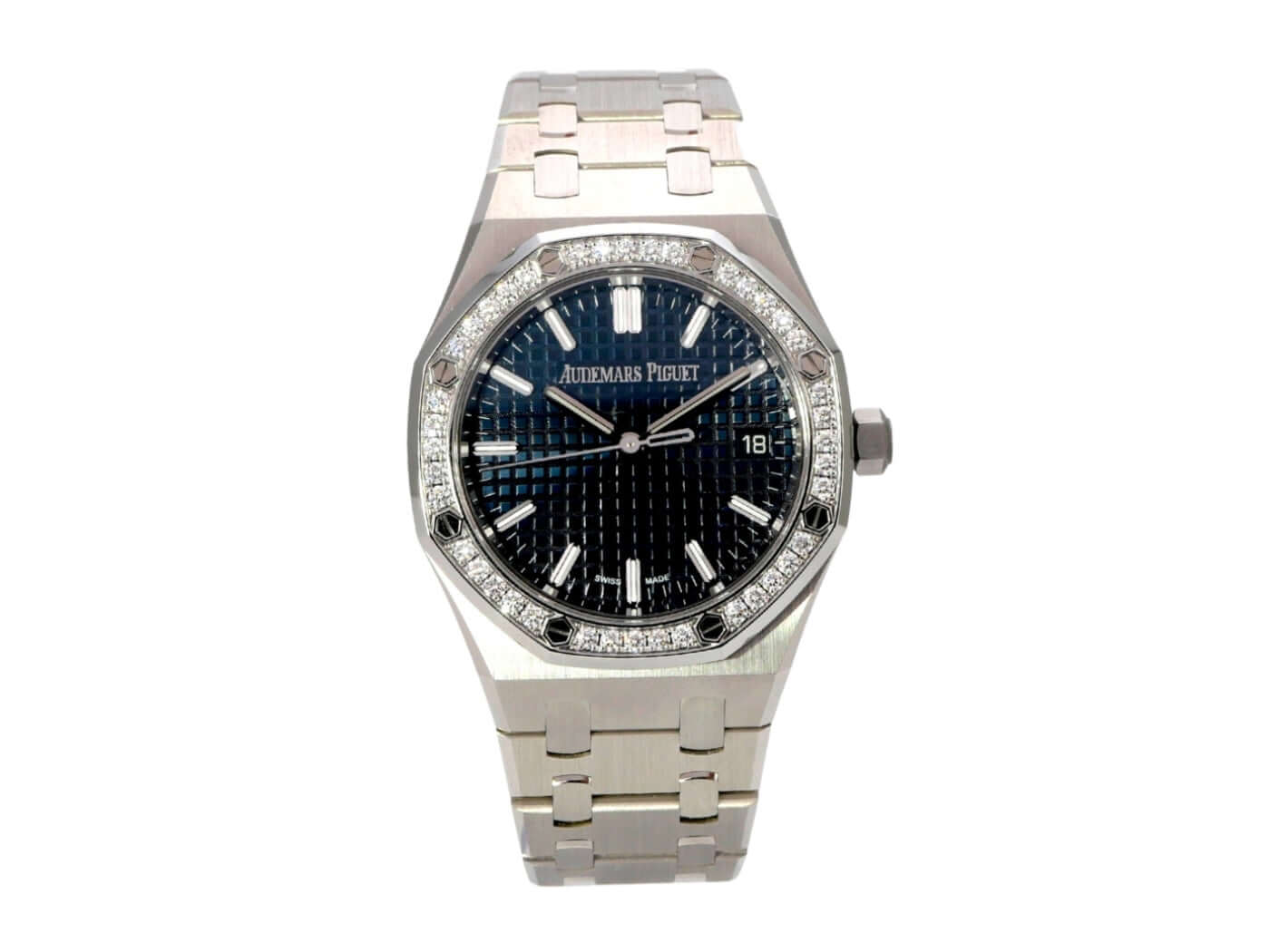 Gehäuse aus Edelstahl poliert und satiniert, Gehäusedurchmesser 34 mm, Gehäusehöhe 8.8 mm, Lünette aus Edelstahl mit 40 Diamanten besetzt, Edelstahlband mit Faltschließe, blaues Zifferblatt mit Leuchtindizes, Leuchtzeiger, Kaliber 5800, Datumsanzeige, entspiegeltes Saphirglas, wasserdicht bis zu 5 bar.