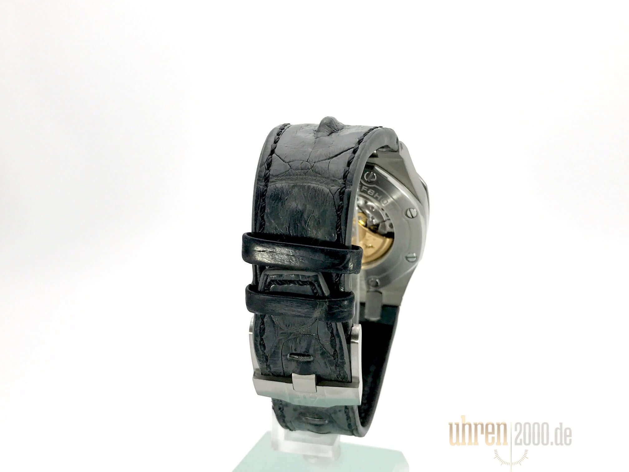 Gehäuse aus Edelstahl poliert und satiniert, Gehäusedurchmesser 42 mm, Gehäusehöhe 14,2 mm, Edelstahl Lünette poliert und satiniert und verschraubt, graues Krokodilleder Armband Handgenäht "Hornback" mit Dornschließe, graues Zifferblatt mit schwarzen arabischen Ziffern mit Leuchtmasse, Tachymeter Skala, Automatikwerk, Manufakturkaliber 3126 / 3840 mit 59 Steine, Schwingung 21.600 A/h, Gangreserve für ca. 50 Stunden, Datumsanzeige, entspiegeltes Saphirglas, Sichtboden verschraubt, Wasserdicht bis zu 10 bar.