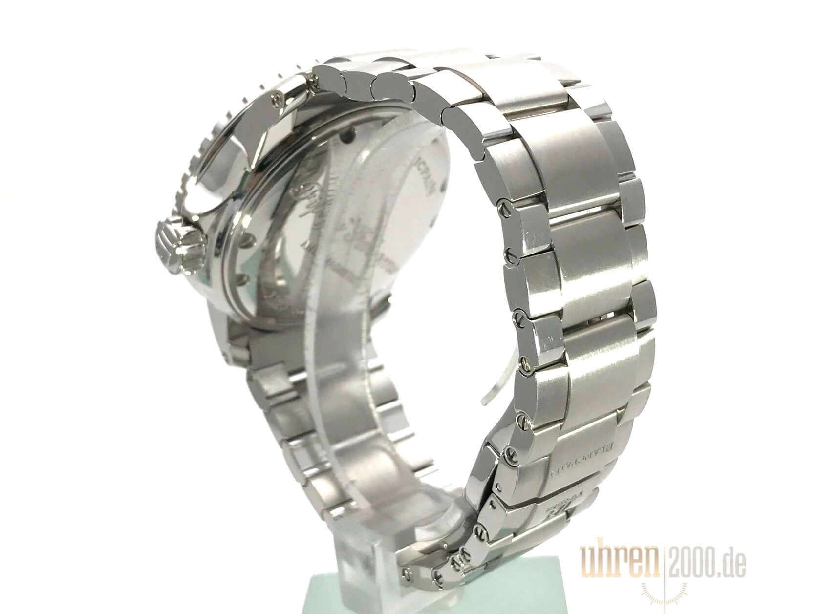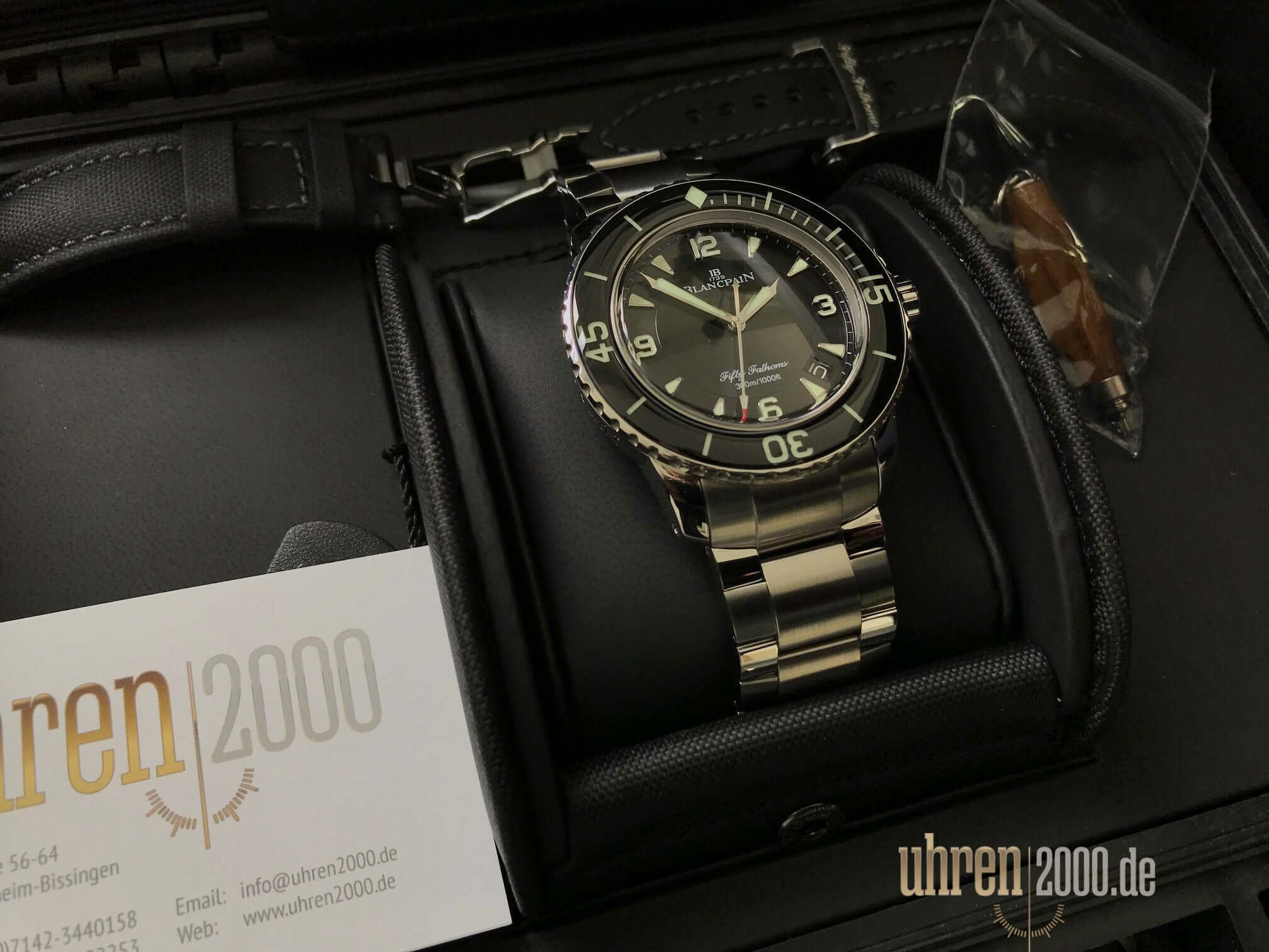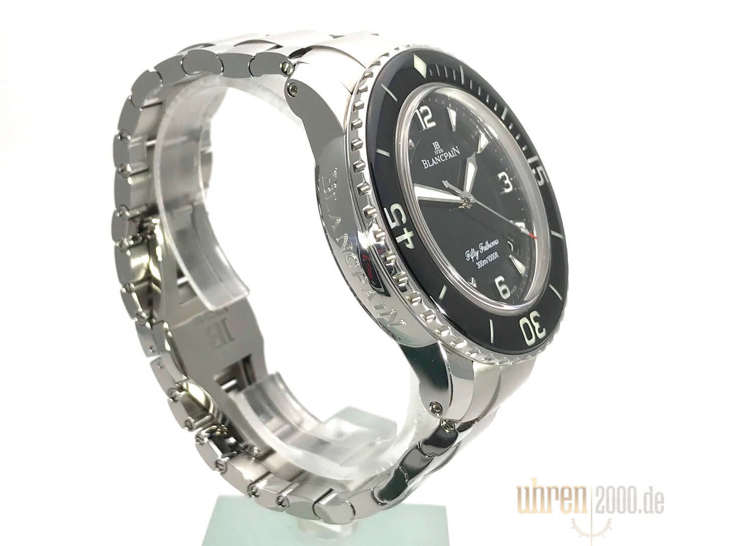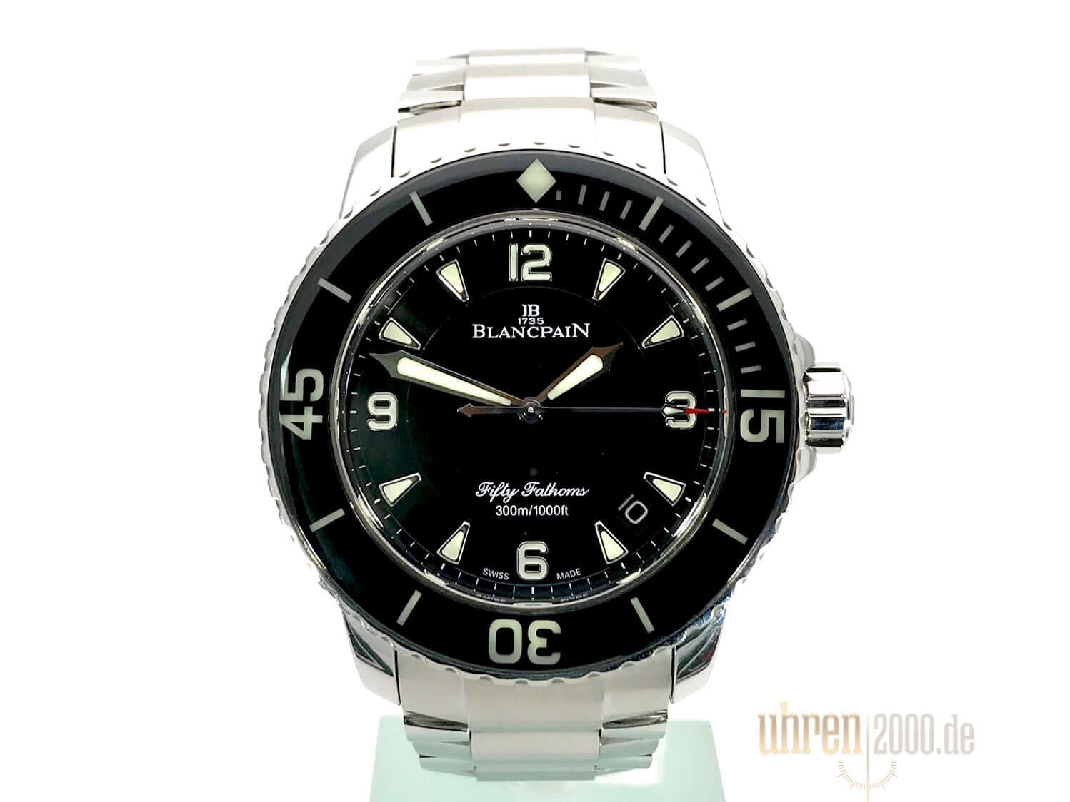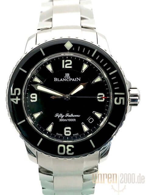 Gehäuse aus Edelstahl poliert und satiniert, Gehäusedurchmesser 45 mm, Edelstahl Lünette mit schwarzer Einlage, einseitig drehbar mit Sperre, Edelstahlarband mit Faltschließe sowie schwarzes Segeltucharmband mit Faltschließe, schwarzes Zifferblatt mit aufgesetzten Leuchtindizes, Leuchtzeiger, Sekundenzeiger mit Leuchtspitze, Zentralsekunde, Automatik, Kaliber Blancpain 1315, 35 Steine, Gangreserve ca. 120 Stunden, Datum, Saphirglas, verschraubte Krone mit Flankenschutz, Edelstahlboden verschraubt, Wasserdicht bis zu 30 bar.