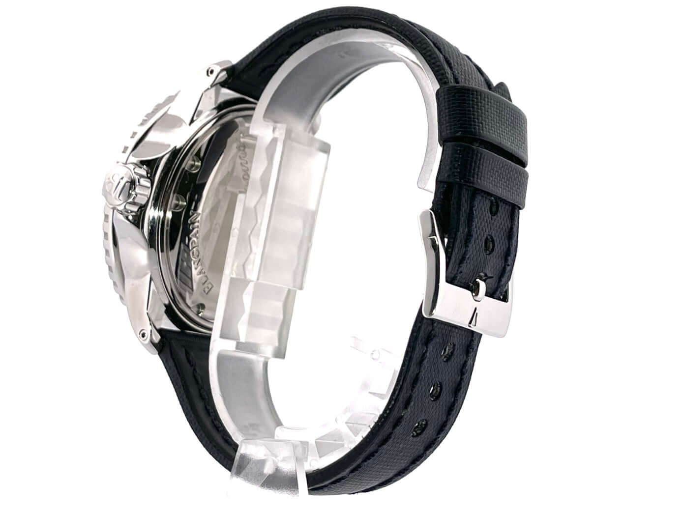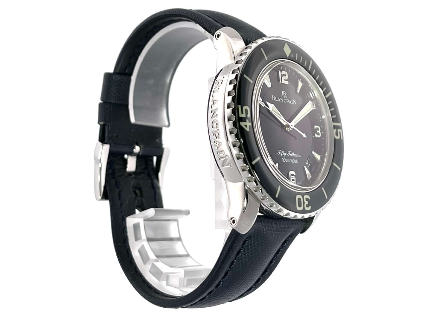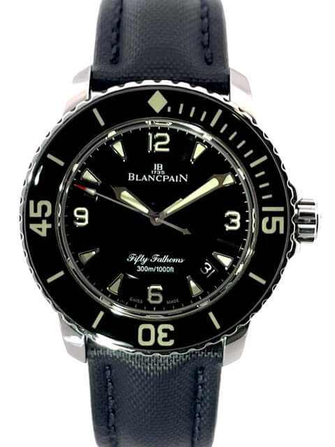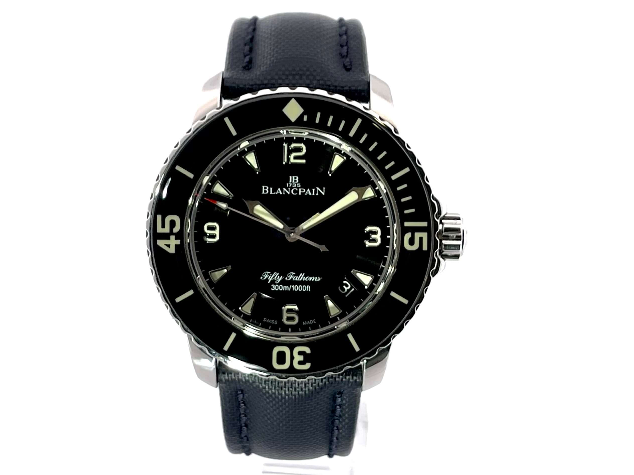 Gehäuse aus Edelstahl poliert und satiniert, Gehäusedurchmesser 45 mm, Edelstahl Lünette mit schwarzer Einlage, einseitig drehbar mit Sperre, dunkelblaues Segeltucharmband mit Dornschließe, schwarzes Zifferblatt mit aufgesetzten Leuchtindizes, Leuchtzeiger, Sekundenzeiger mit Leuchtspitze, Zentralsekunde, Automatik, Kaliber Blancpain 1315, 35 Steine, Gangreserve ca. 120 Stunden, Datum, Saphirglas, verschraubte Krone mit Flankenschutz, Edelstahlboden verschraubt, Wasserdicht bis zu 30 bar.