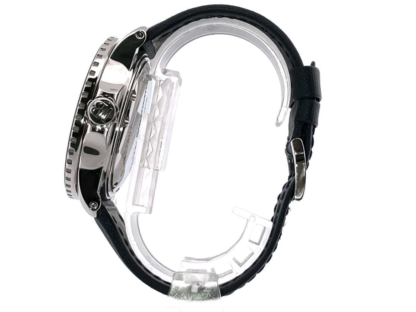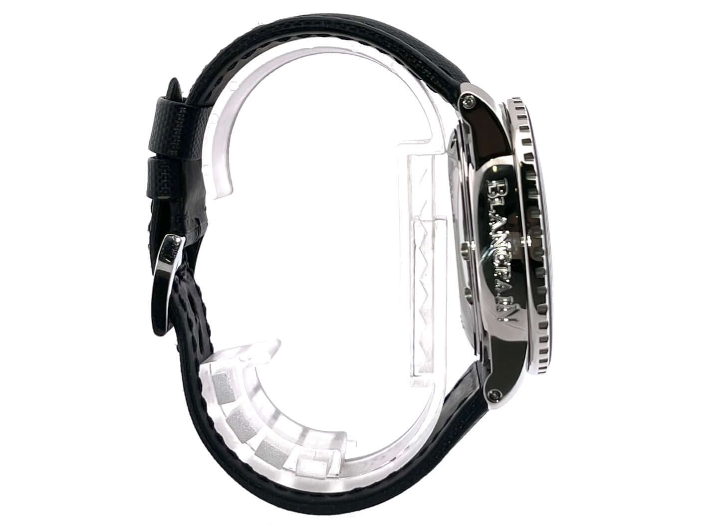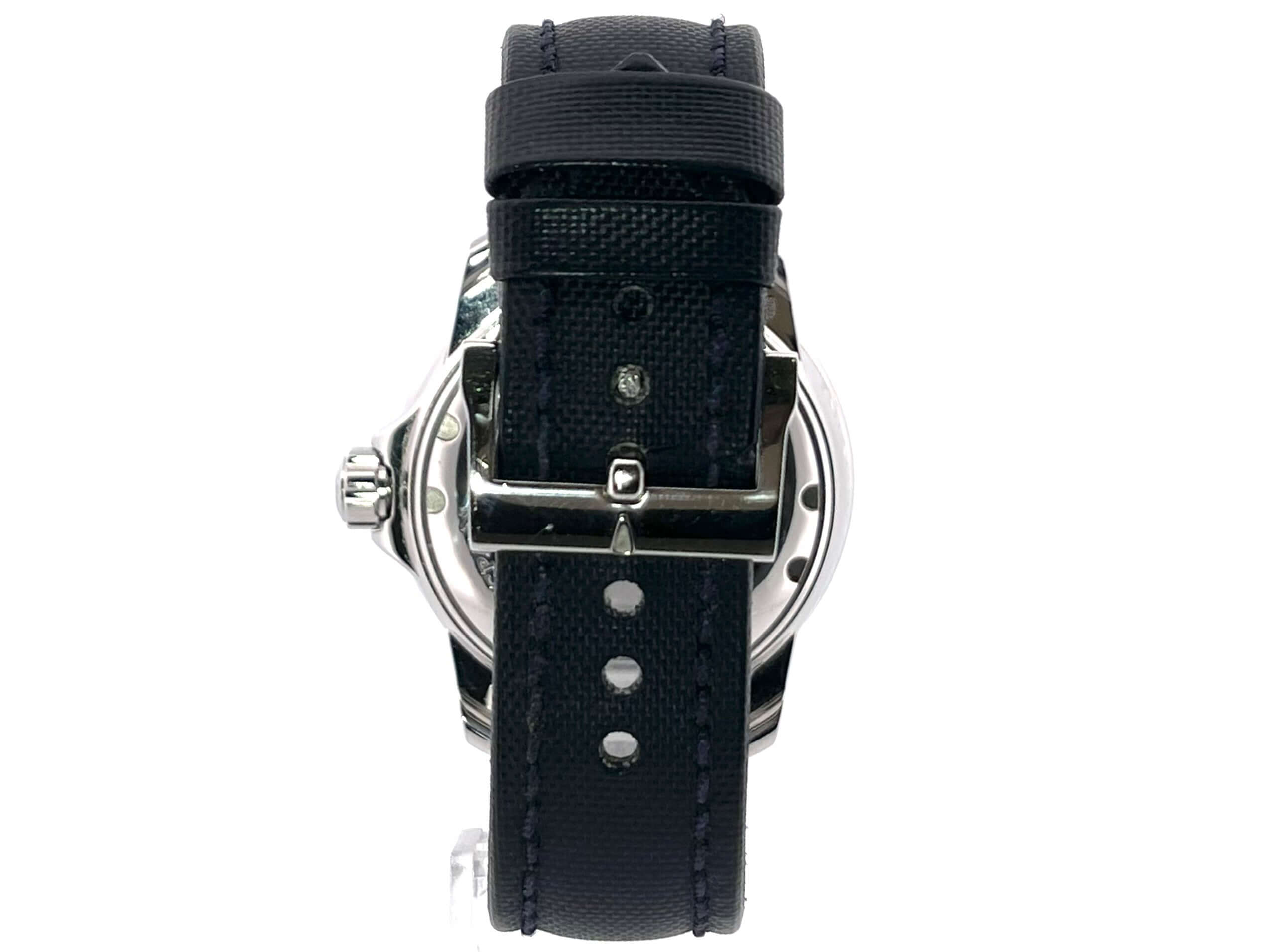 Gehäuse aus Edelstahl poliert und satiniert, Gehäusedurchmesser 45 mm, Edelstahl Lünette mit schwarzer Einlage, einseitig drehbar mit Sperre, dunkelblaues Segeltucharmband mit Dornschließe, schwarzes Zifferblatt mit aufgesetzten Leuchtindizes, Leuchtzeiger, Sekundenzeiger mit Leuchtspitze, Zentralsekunde, Automatik, Kaliber Blancpain 1315, 35 Steine, Gangreserve ca. 120 Stunden, Datum, Saphirglas, verschraubte Krone mit Flankenschutz, Edelstahlboden verschraubt, Wasserdicht bis zu 30 bar.