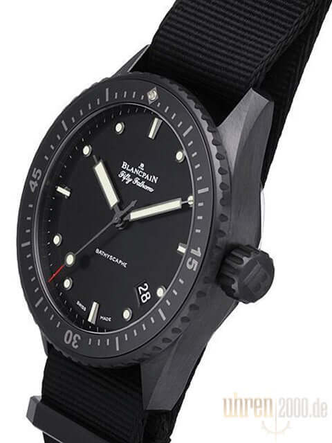 Gehäuse aus schwarzer Keramik satiniert, Gehäusedurchmesser 43,6 mm, Keramik Lünette, drehbar mit Sperre, schwarzes Zifferblatt mit aufgesetzten Leuchtpunkten, Leuchtzeiger, schwarzes Natoband mit Dornschließe, Sekundenzeiger mit Leuchtspitze, Zentralsekunde, Uhrwerk Automatik, Kaliber Blancpain 1315, 35 Steine, Gangreserve ca. 120 Stunden, Datum, Saphirglas, verschraubte Krone mit Flankenschutz, Keramikboden verschraubt mit Sichtfenster, Wasserdicht bis zu 30 bar.
