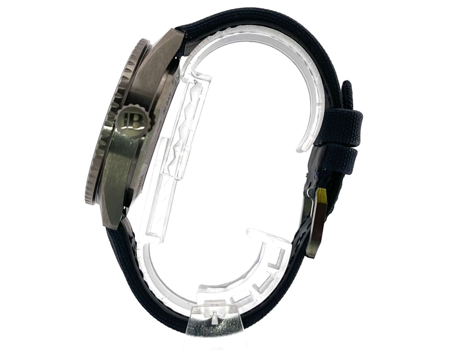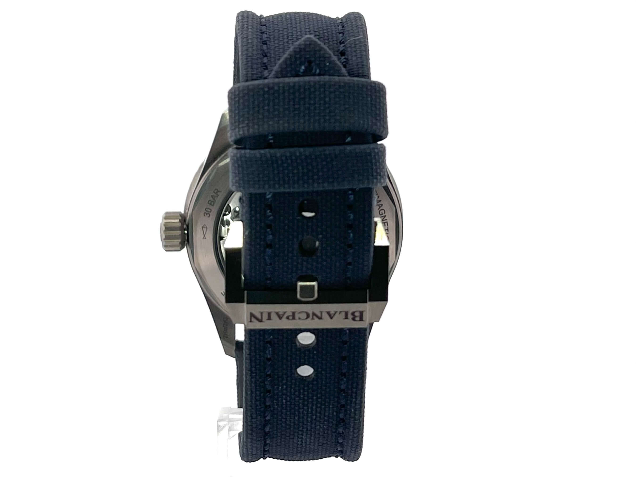 Gehäuse aus grauer Keramik satiniert, Gehäusedurchmesser 43,6 mm, Keramik Lünette, drehbar mit Sperre, blaues Segeltuchband mit Dornschließe, blaues Zifferblatt mit aufgesetzten Leuchtpunkten, Leuchtzeiger, Sekundenzeiger mit Leuchtspitze, Zentralsekunde, Uhrwerk Automatik, Kaliber Blancpain 1315, 35 Steine, Gangreserve ca. 120 Stunden, Datum, Saphirglas, verschraubte Krone mit Flankenschutz, Keramikboden verschraubt mit Sichtfenster, Wasserdicht bis zu 30 bar.