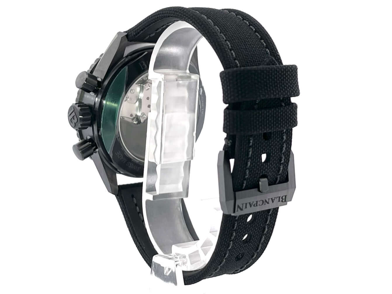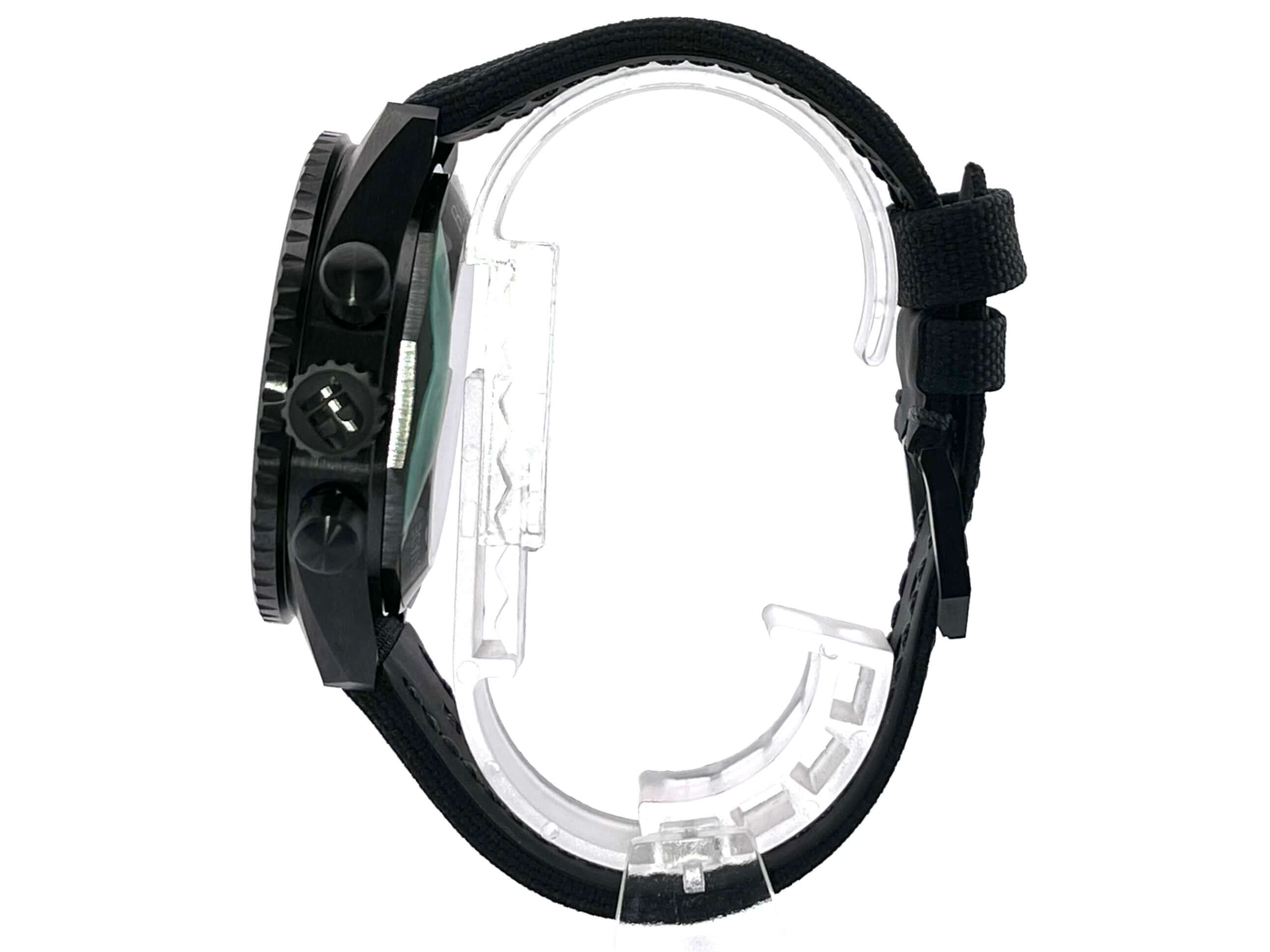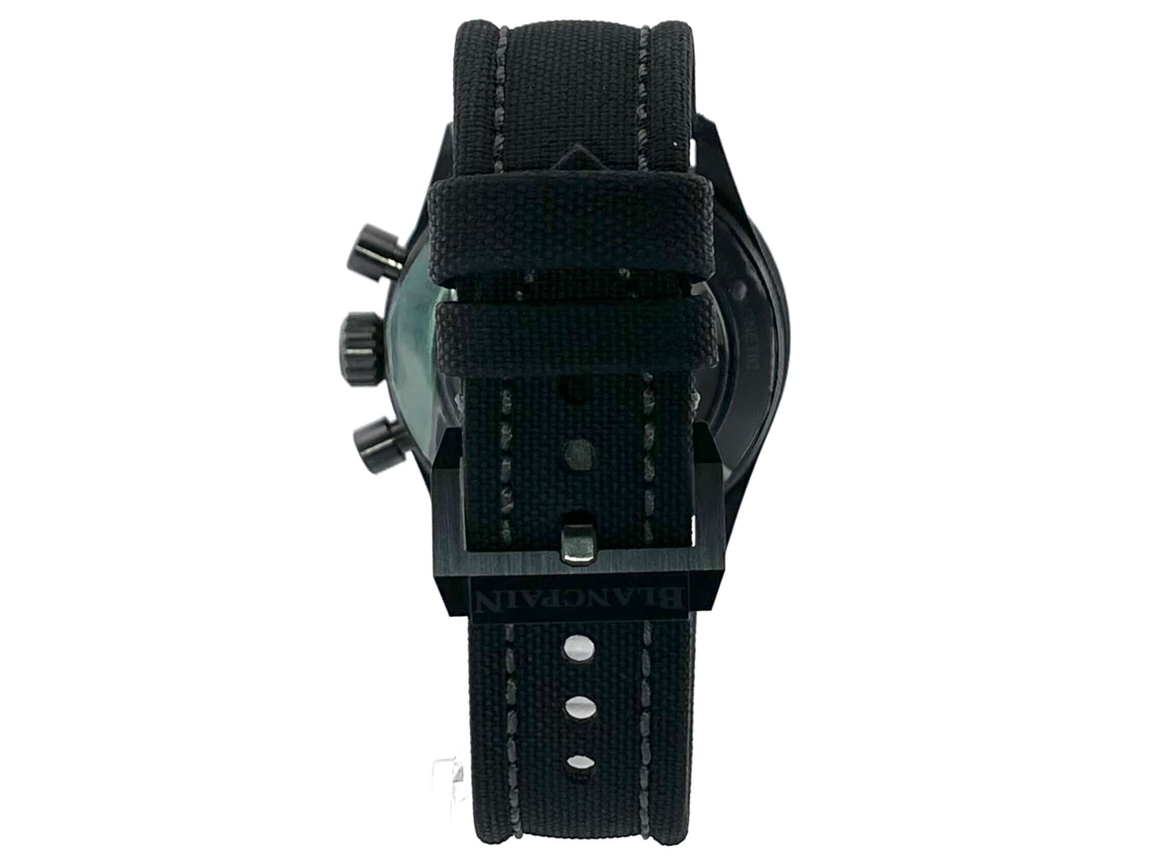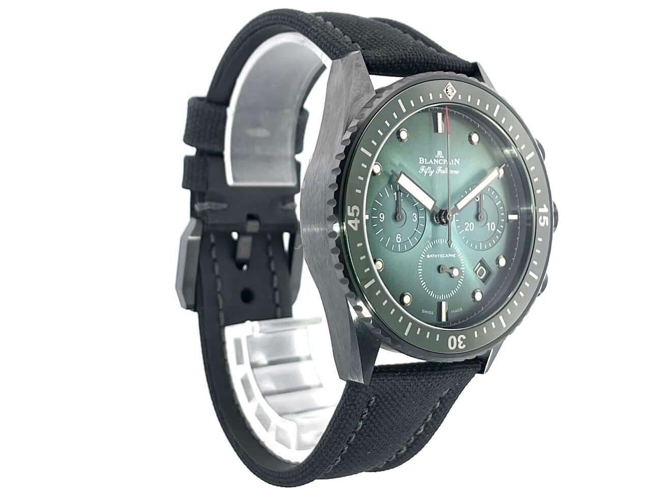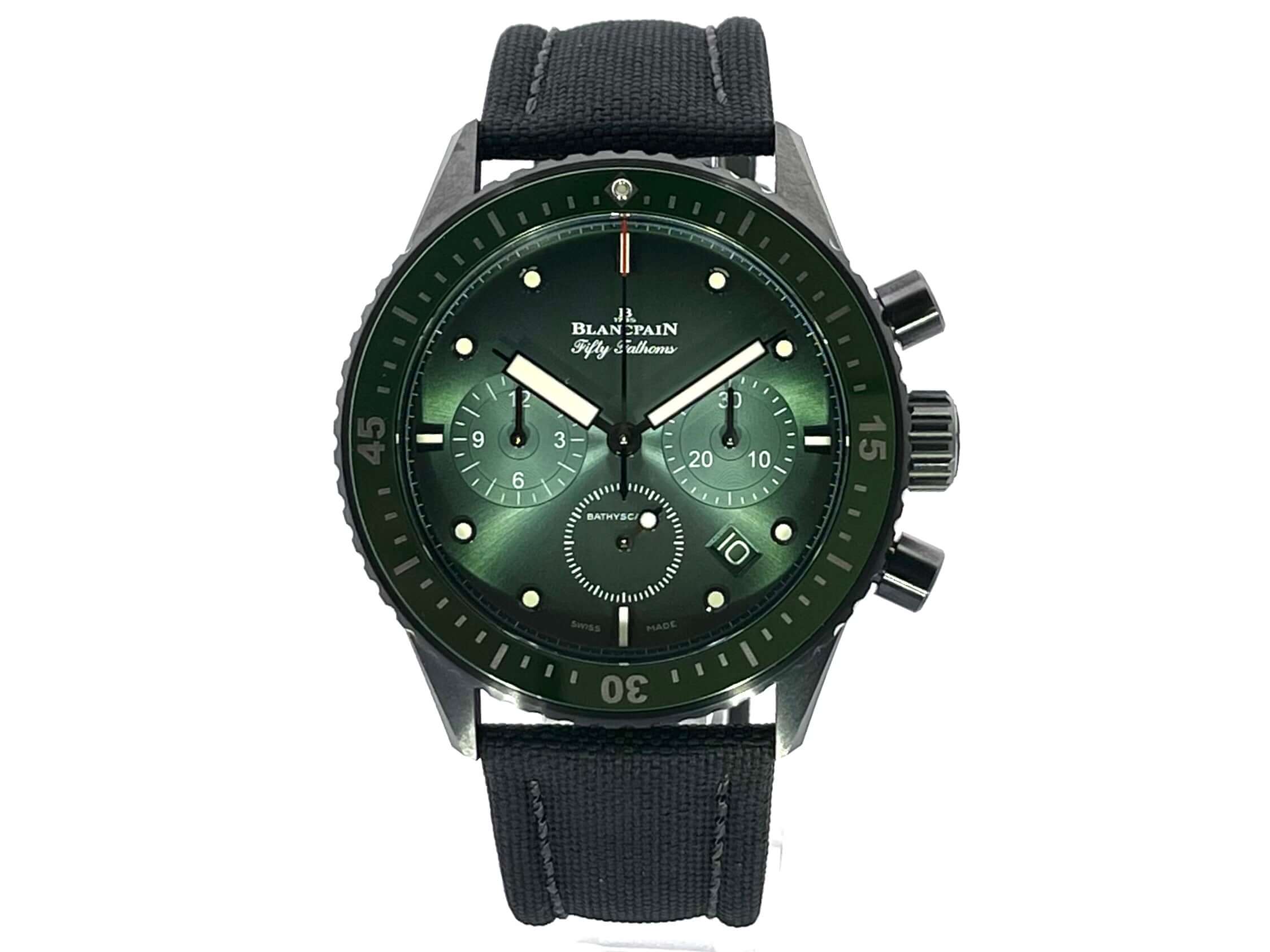 Gehäuse aus Keramik satiniert, Gehäusedurchmesser 43 mm, Keramik Lünette mit grüner Keramikeinlage, drehbar mit Sperre, schwarzes Segeltuchband mit Dornschließe, grünes Zifferblatt mit aufgesetzten Leuchtpunkten, Leuchtzeiger, kleiner Sekundenzeiger mit Leuchtspitze, Uhrwerk Automatik, Kaliber Blancpain F385, 37 Steine, Gangreserve ca. 50 Stunden, Datum, Saphirglas, verschraubte Krone mit Flankenschutz, Keramikboden verschraubt mit Sichtfenster, Wasserdicht bis zu 30 bar.