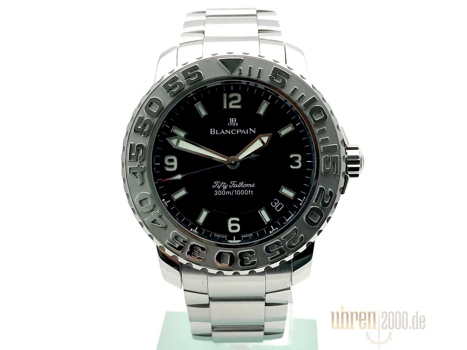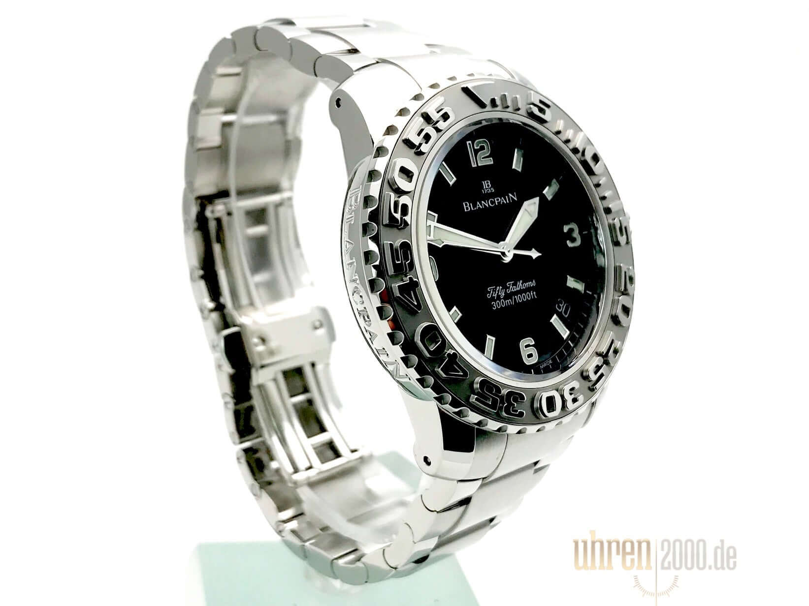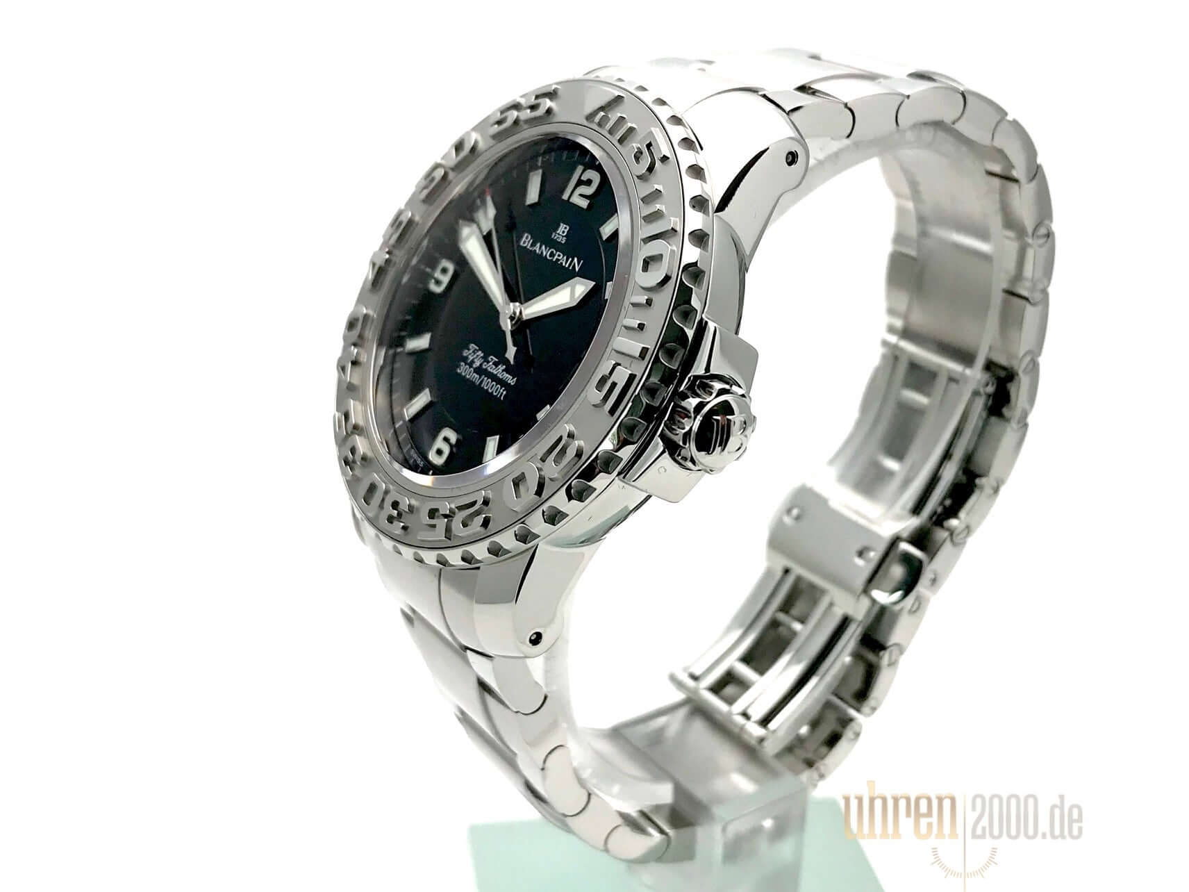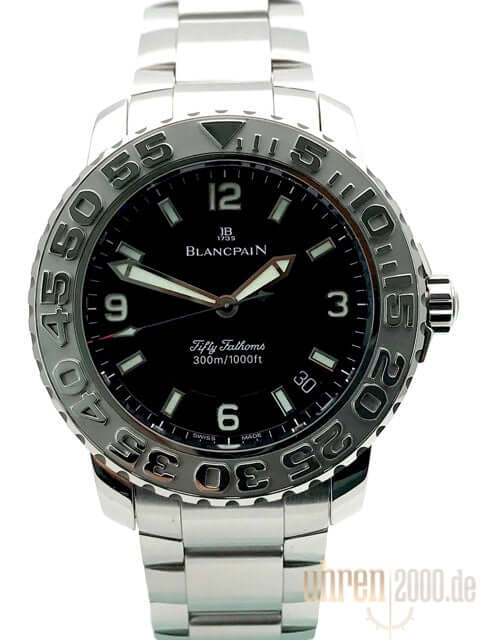 Gehäuse Edelstahl poliert und satiniert, Gehäusedurchmesser 40 mm, Edelstahl Lünette, einseitig drehbar mit Sperre, Edelstahlband mit Faltschließe, schwarzes Zifferblatt mit aufgesetzten Leuchtindexen, Leuchtzeiger, Sekundenzeiger mit Leuchtspitze, Zentralsekunde, Uhrwerk Automatik, Kaliber Blancpain 1151, 29 Steine, Gangreserve ca. 100 Stunden, Datum, Saphirglas, verschraubte Krone mit Flankenschutz, Edelstahlboden verschraubt, Wasserdicht bis zu 30 bar.