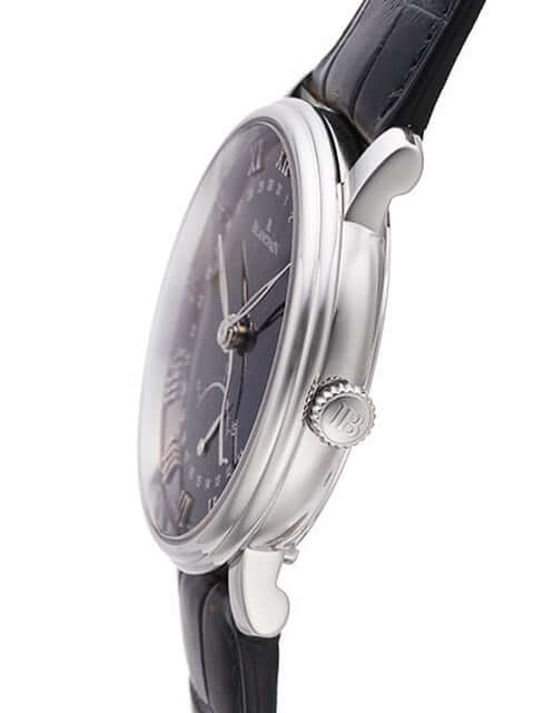 Gehäuse aus 18 kt Weißgold poliert und satiniert, Gehäusedurchmesser 40 mm, Weißgold Lünette, blaues Lederarmband mit Faltschließe, blaues Zifferblatt, Uhrwerk Automatik, Kaliber Blancpain 7663Q, 34 Steine, Gangreserve ca. 65 Stunden, Datum, kleine Sekunde, Saphirglas, Weißgoldboden verschraubt mit Sichtfenster, Wasserdicht bis zu 3 bar.