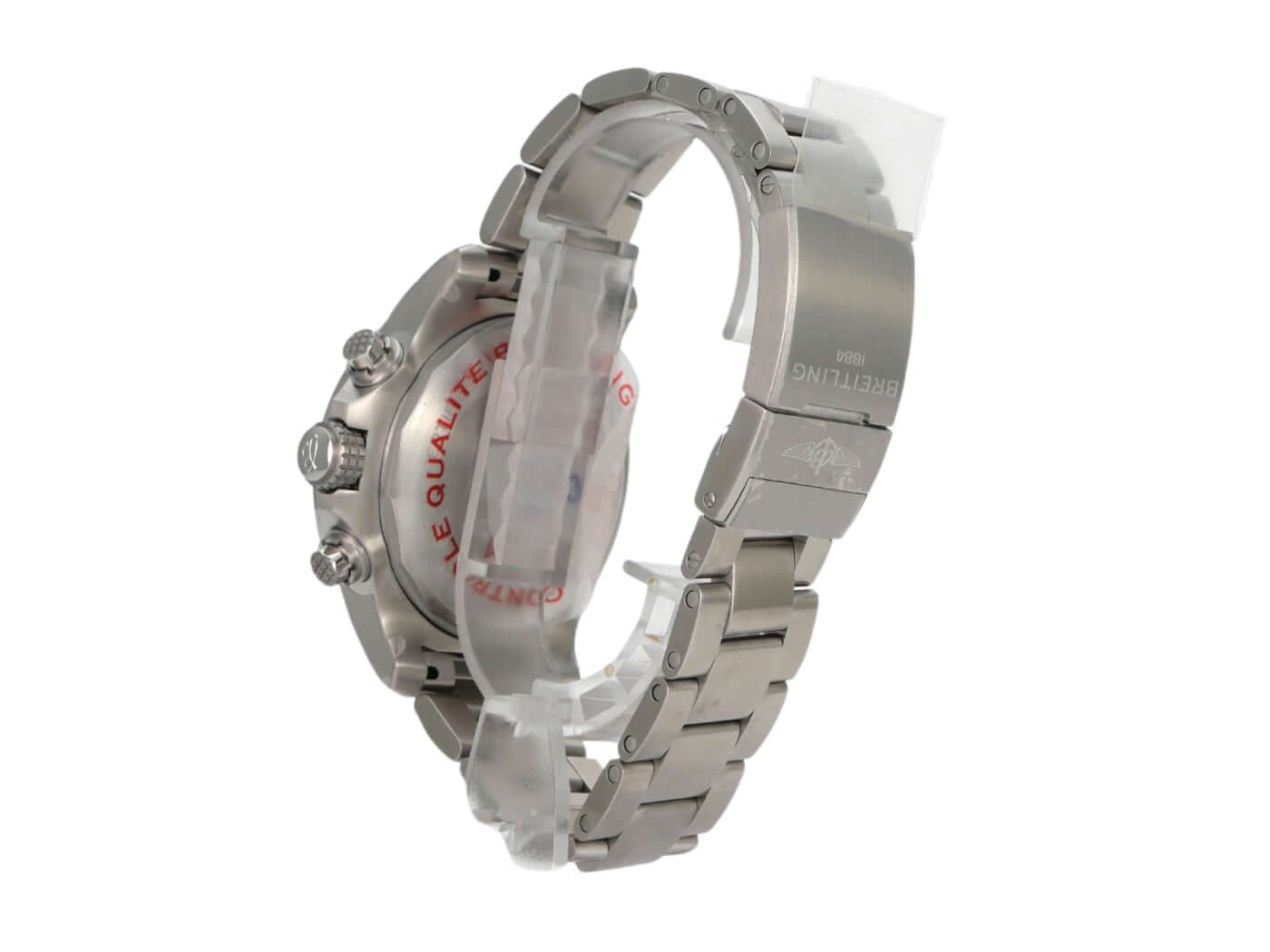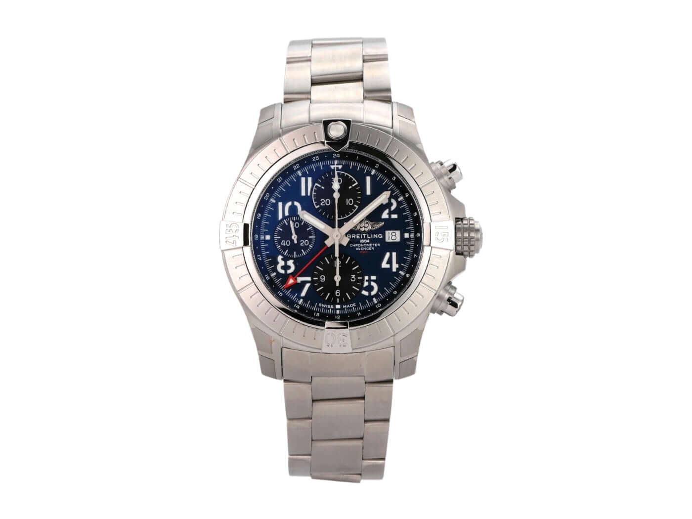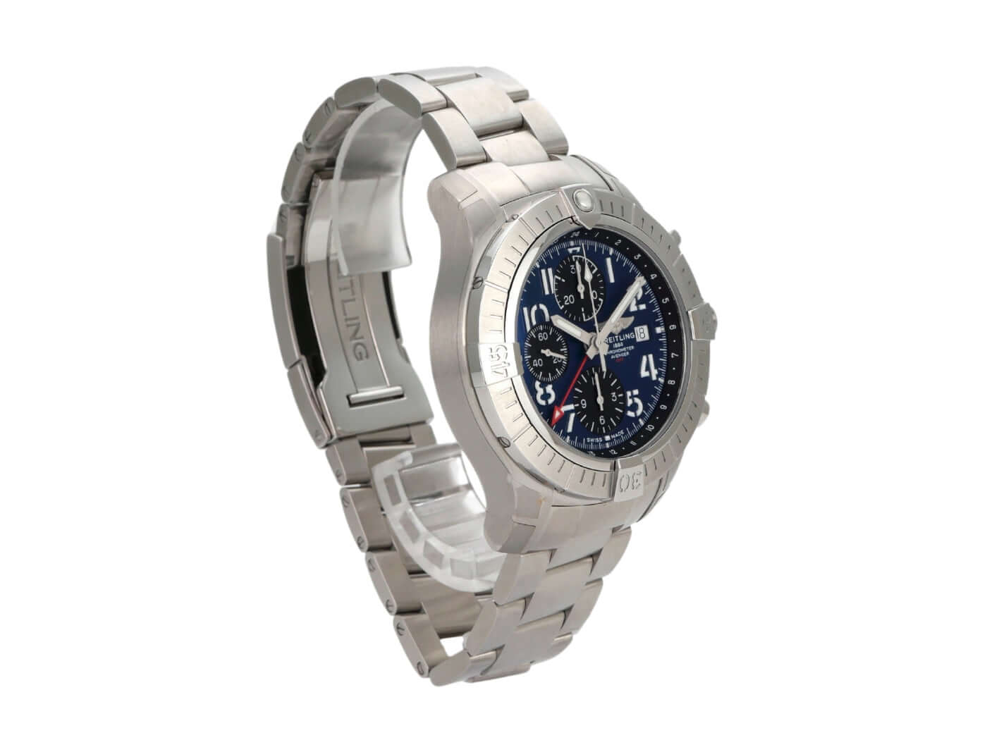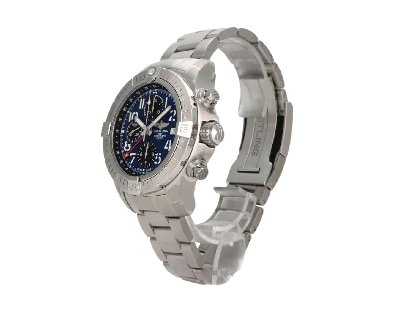 Gehäuse aus Edelstahl satiniert, Gehäusedurchmesser 45 mm, Gehäusehöhe 16,46 mm, Edelstahl Lünette mit Leuchtpunkt, einseitig drehbar mit Sperre, satiniertes Edelstahlband mit Faltschließe, blaues Zifferblatt mit aufgesetzten arabischen Ziffern, Leuchtzeiger, schwarze Totalisatoren, Automatik, Kaliber Breitling 24 mit 25 Steinen, 28.800 A/h, Gangreserve ca. 42 Stunden, Datumsanzeige, Chronograph, GMT, Chronometer, Saphirglas bombiert, doppelseitig entspiegelt, Krone verschraubt mit Flankenschutz, Edelstahlboden verschraubt, wasserdicht bis zu 30 bar.