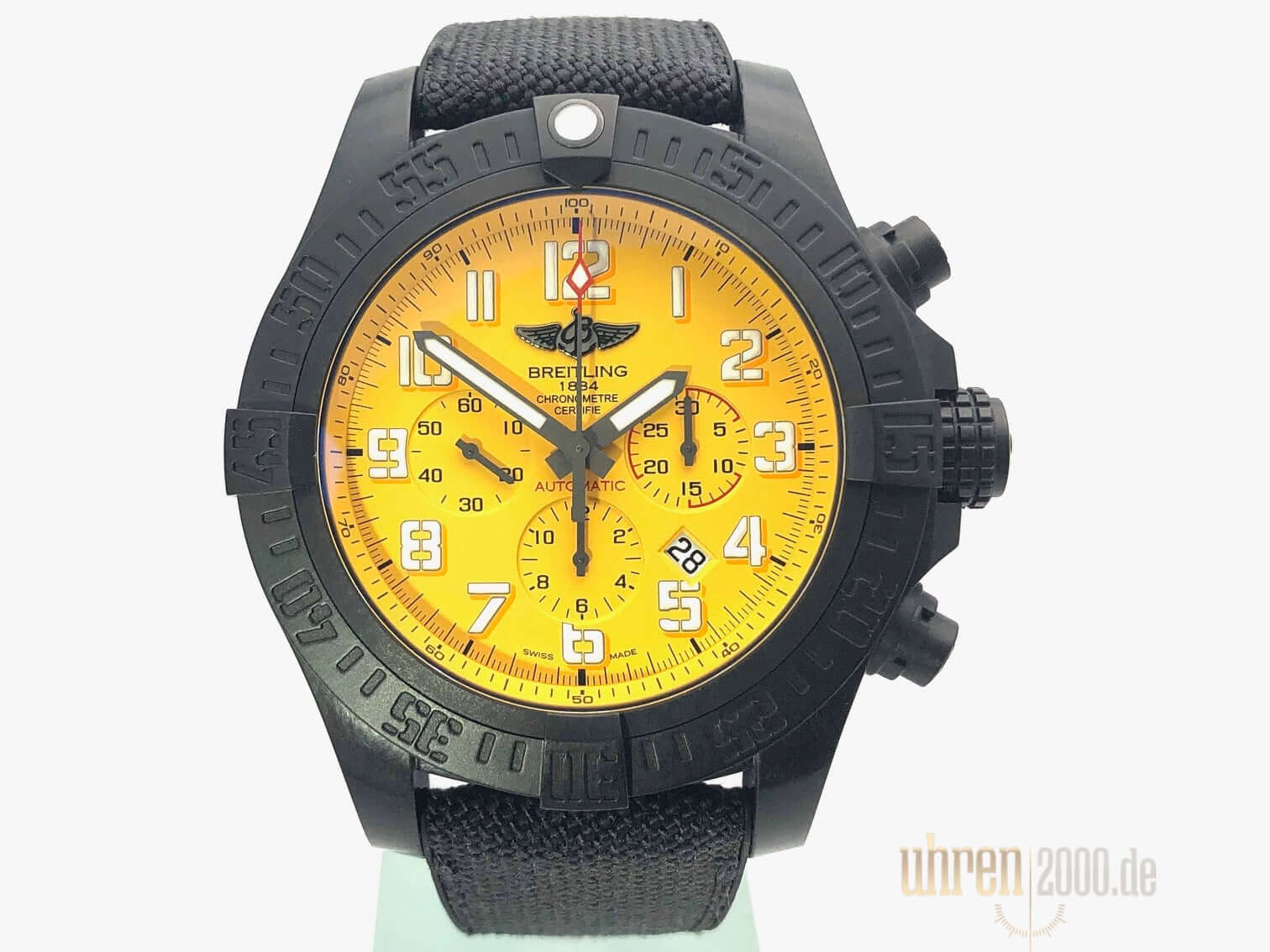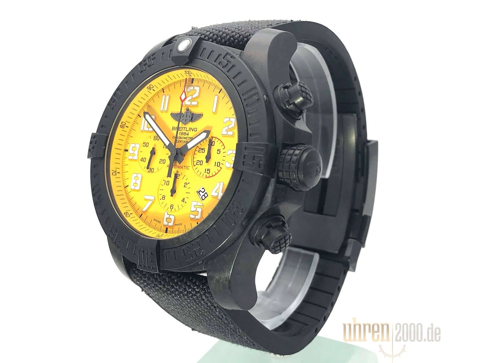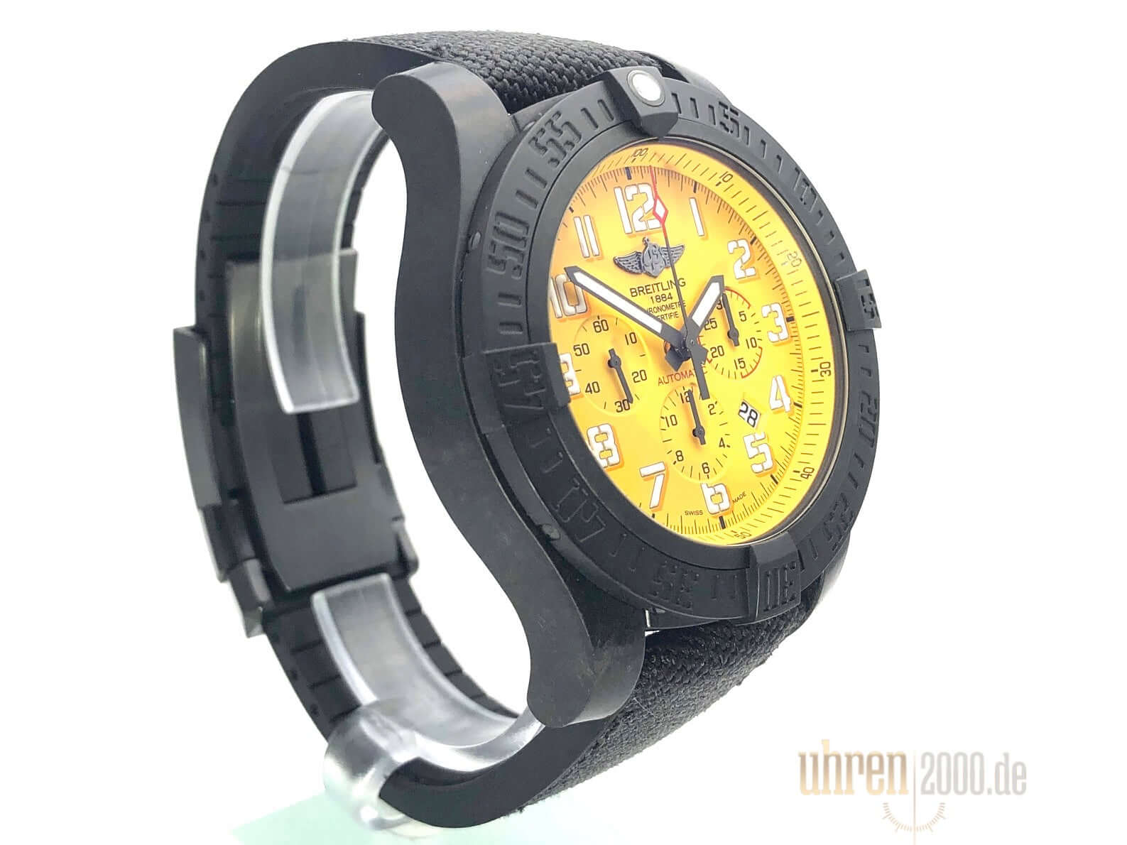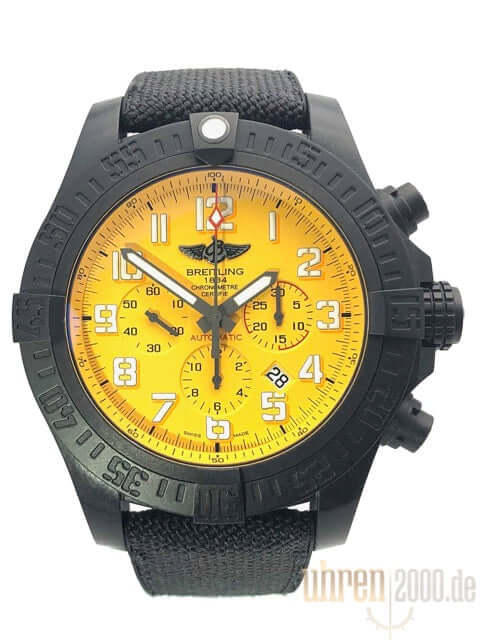 Gehäuse aus Breitlight, Gehäusedurchmesser 50 mm, Gehäusehöhe 16,97 mm, Breitlight Lünette einseitig drehbar, schwarzes Military-Kautschuk Armband mit Faltschließe, gelbes Zifferblatt mit aufgesetzten Leuchtziffern und Leuchtzeiger, Automatikwerk, Manufakturkaliber Breitling 01 mit 47 Steine, 28.800 A/h, Gangreserve ca. 70 Stunden, Datumsanzeige, Chronograph, Chronometer, Saphirglas doppelseitig entspiegelt, Breitlight Boden, Wasserdicht bis zu 10 bar.
