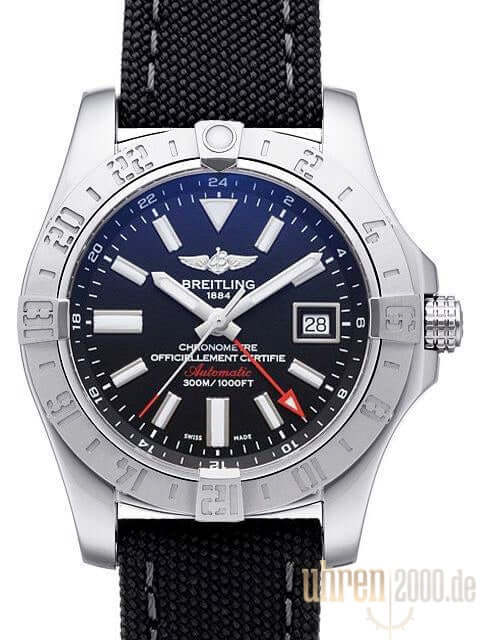 Gehäuse aus Edelstahl poliert, Gehäusedurchmesser 43 mm, Gehäusehöhe 12,20 mm, Edelstahl Lünette mit Leuchtpunkt, beidseitig drehbar mit Sperre, schwarzes Military Textil-Armband mit Dornschließe, schwarzes Zifferblatt mit aufgesetzten Leuchtindizes, Leuchtzeiger, Automatik, Kaliber Breitling 32 mit 21 Steinen, 28.800 A/h, Gangreserve ca. 42 Stunden, Datumsanzeige, zweite Zeitzone, Saphirglas bombiert, doppelseitig entspiegelt, Krone verschraubbar mit Flankenschutz, Edelstahlboden verschraubt, Wasserdicht bis zu 30 bar.