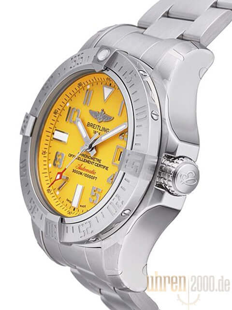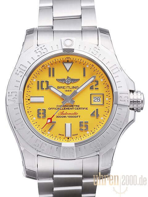 Gehäuse aus Edelstahl poliert und satiniert, Gehäusedurchmesser 45 mm, Gehäusehöhe 18,40 mm, Edelstahl Lünette mit 60 Minuten Skala, einseitig drehbar mit Sperre, Professional III Edelstahlband poliert und satiniert mit Faltschließe, glebes Zifferblatt mit aufgesetzten Leuchtindexen und arabische Ziffern, Leuchtzeiger, Sekundenzeiger mit Leuchtspitze, Zentralsekunde, Automatik, Kaliber Breitling 17, 25 Steine, 28.800 A/h, Gangreserve ca. 40 Stunden, Datum, Chronometer, Saphirglas bombiert und doppelseitig entspiegelt, Krone verschraubbar mit Flankenschutz, 2 Dichtungen, Edelstahlboden verschraubt, Wasserdicht bis zu 300 bar.
