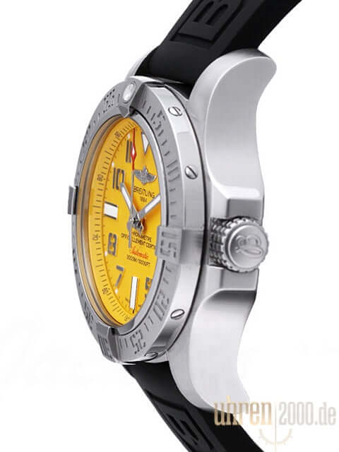 Gehäuse aus Edelstahl poliert und satiniert, Gehäusedurchmesser 45 mm, Gehäusehöhe 18,40 mm, Edelstahl Lünette mit 60 Minuten Skala, einseitig drehbar mit Sperre, schwarzes Diver Pro III Kautschukband mit Dornschließe, gelbes Zifferblatt mit aufgesetzten Leuchtindizes und arabischen Ziffern, Leuchtzeiger, Sekundenzeiger mit Leuchtspitze, Automatik, Kaliber Breitling 17, 25 Steine, 28.800 A/h, Gangreserve ca. 40 Stunden, Datum, Chronometer, Zentralsekunde, Saphirglas bombiert und beidseitig entspiegelt, Krone verschraubbar mit Flankenschutz, 2 Dichtungen, Edelstahlboden verschraubt, Wasserdicht bis zu 300 bar.