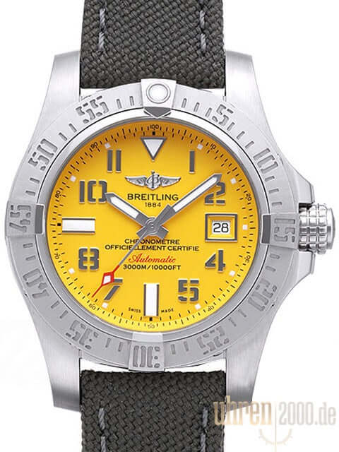 Gehäuse aus Edelstahl poliert und satiniert, Gehäusedurchmesser 45 mm, Gehäusehöhe 18,40 mm, Edelstahl Lünette mit 60 Minuten Skala, einseitig drehbar mit Sperre, Anthrazitfarbenes Military Textilband mit Dornschließe, gelbes Zifferblatt mit aufgesetzten Leuchtindizes und arabischen Ziffern, Leuchtzeiger, Sekundenzeiger mit Leuchtspitze, Automatik, Kaliber Breitling 17, 25 Steine, 28.800 A/h, Gangreserve ca. 40 Stunden, Datum, Chronometer, Zentralsekunde, Saphirglas bombiert und beidseitig entspiegelt, Krone verschraubbar mit Flankenschutz, 2 Dichtungen, Edelstahlboden verschraubt, Wasserdicht bis zu 300 bar.