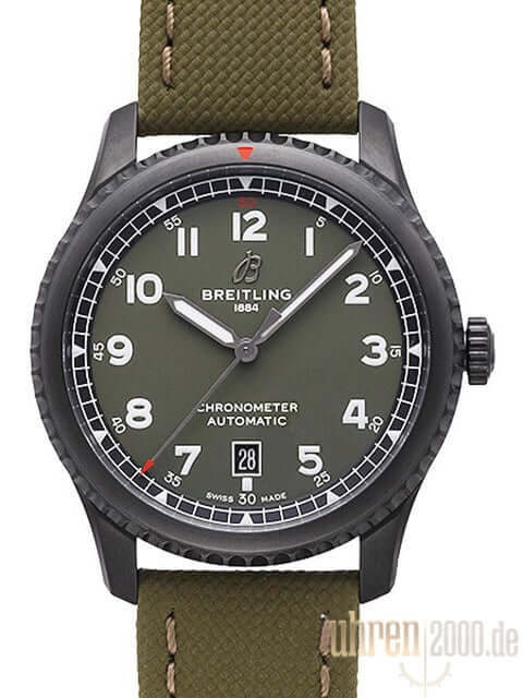 Gehäuse aus Edelstahl schwarz beschichtet, Gehäusedurchmesser 41 mm, Gehäusehöhe 10,74 mm, drehbare Edelstahl Lünette schwarz beschichtet mit Rechenschieber, grünes Militärarmband mit Dornschließe, grünes Zifferblatt mit aufgesetzten Leuchtziffern, Leuchtzeiger, Automatik, Kaliber Breitling 17, 25 Steine, 28.800 A/h, Gangreserve ca. 40 Stunden, Datum, Chronometer, Zentralsekunde, Saphirglas, Edelstahlboden verschraubt, Wasserdicht bis zu 10 bar.