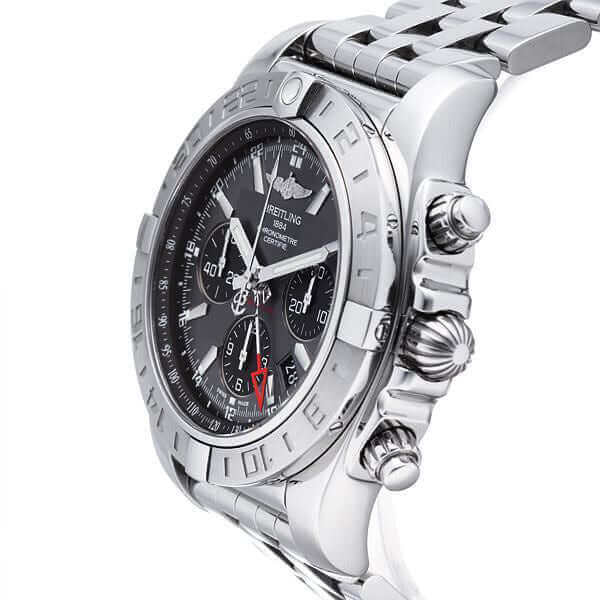 Gehäuse aus Edelstahl poliert und satiniert, Gehäusedurchmesser 44 mm, Gehäusehöhe 16,90 mm, Edelstahl Lünette in 2 Richtungen drehbar, Edelstahl Armband poliert mit Sicherheitsfaltschließe, Zifferblatt Blackeye-Grau mit aufgesetzten Leuchtziffern und Leuchtzeiger, Automatikwerk Chronograph, Chronometer, GMT/Zweite Zeitzone, Manufakturkaliber Breitling 04 mit 47 Steine, 28.800 A/h, Gangreserve ca. 70 Stunden, Datumsanzeige, Saphirglas doppelseitig entspiegelt, Edelstahlboden verschraubt und graviert, Wasserdicht bis zu 20 bar.