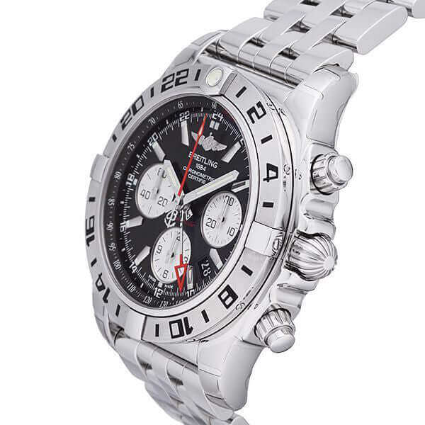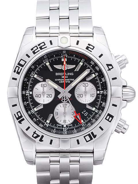 Gehäuse aus Edelstahl poliert und satiniert, Gehäusedurchmesser 44 mm, Gehäusehöhe 16,90 mm, Edelstahl Lünette mit schwarzen Zahlen in 2 Richtungen drehbar, Edelstahl Armband poliert mit Sicherheitsfaltschließe, Zifferblatt Onyx-Schwarz mit aufgesetzten Leuchtziffern und Leuchtzeiger, Automatikwerk, Chronograph, Chronometer, GMT/Zweite Zeitzone, Manufakturkaliber Breitling 04 mit 47 Steine, 28.800 A/h, Gangreserve ca. 70 Stunden, Datumsanzeige, Saphirglas doppelseitig entspiegelt, Edelstahlboden verschraubt und graviert, Wasserdicht bis zu 20 bar.