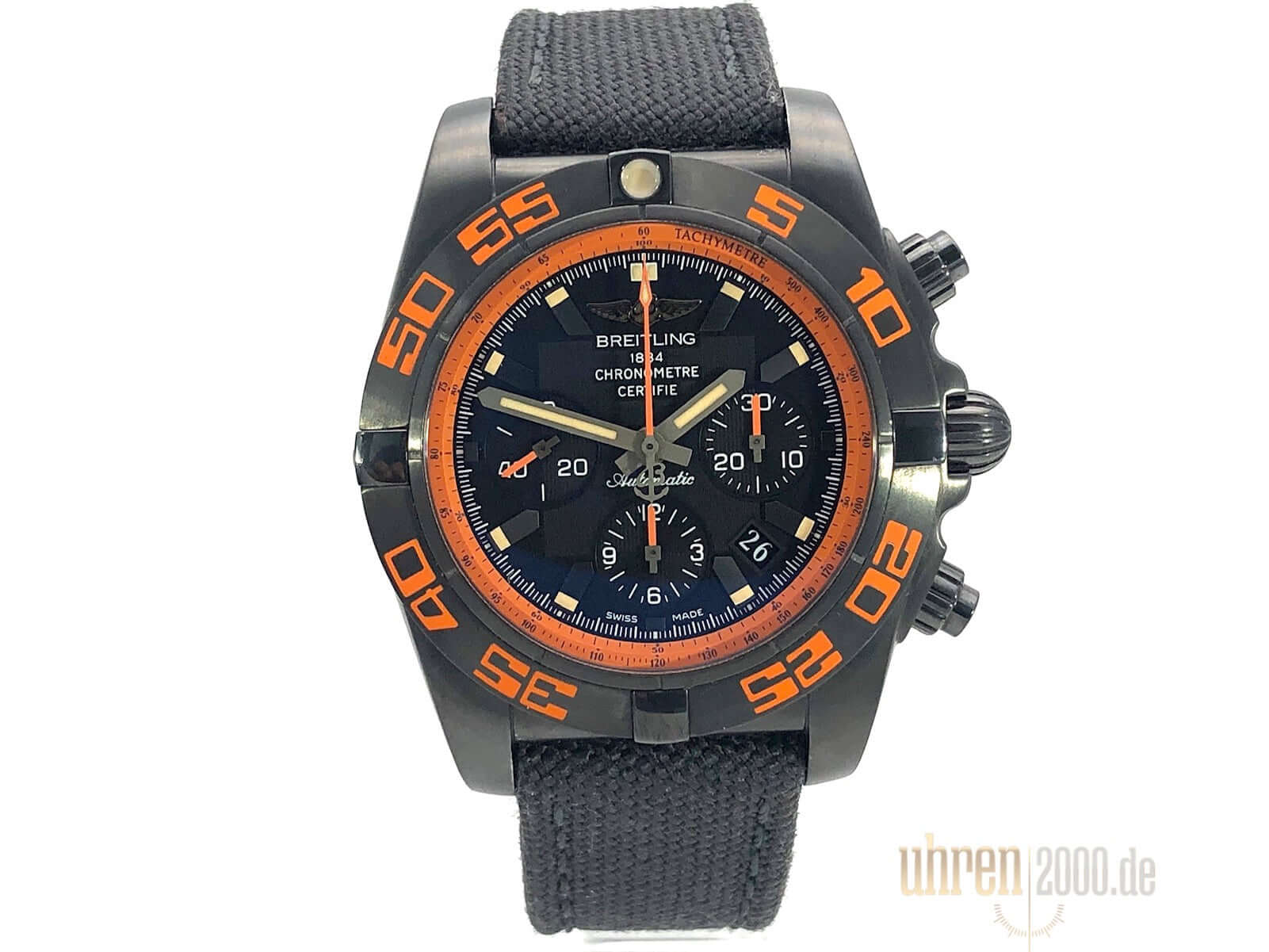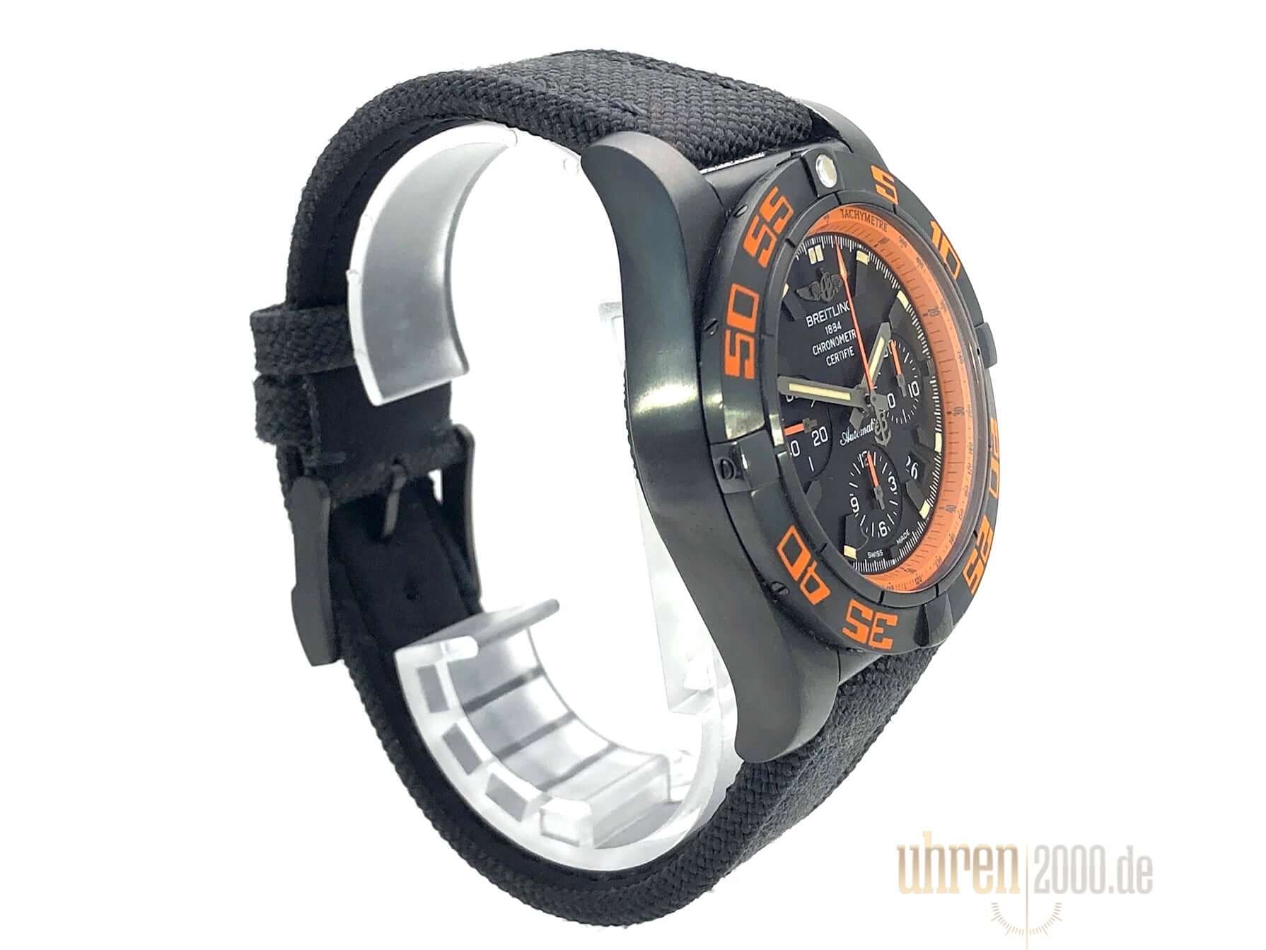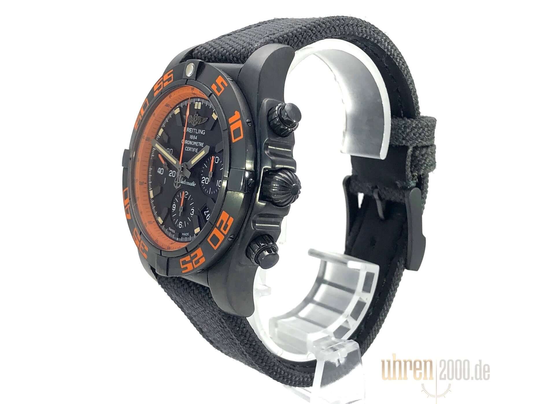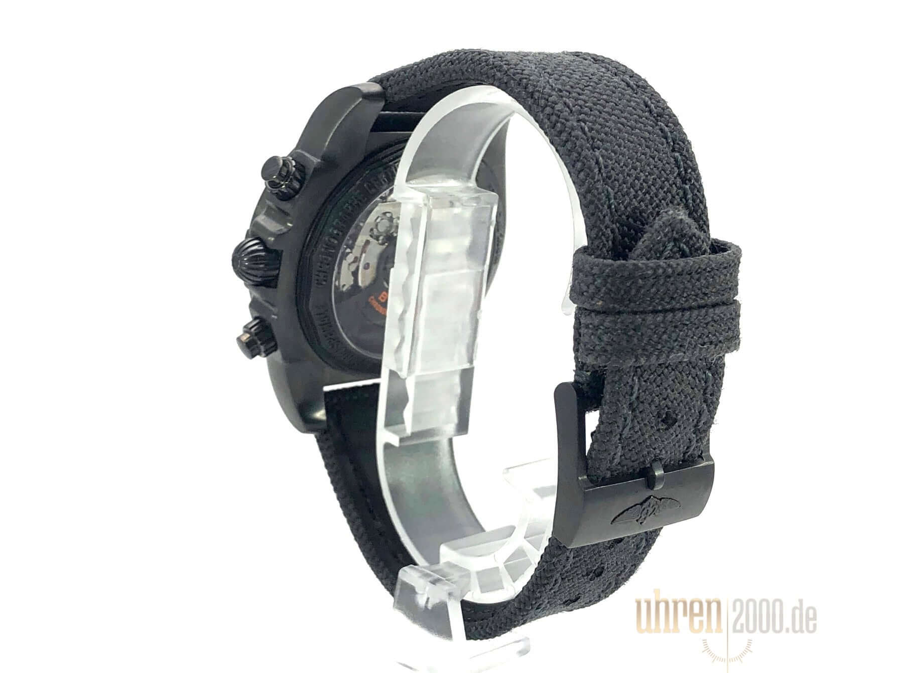 Gehäuse aus Edelstahl schwarz beschichtet, Gehäusedurchmesser 44 mm, Gehäusehöhe 16,95 mm, Edelstahl Lünette schwarz beschichtet einseitig drehbar, schwarzes Textilband mit Dornschließe, Zifferblatt Schwarz mit aufgesetzten Leuchtindizes, Leuchtzeiger, Automatikwerk, Chronograph, Chronometer, Manufakturkaliber Breitling 01 mit 47 Steine, 28.800 A/h, Gangreserve ca. 70 Stunden, Datumsanzeige, Saphirglas doppelseitig entspiegelt, Edelstahlboden schwarz beschichtet mit Sichtfenster, Wasserdicht bis zu 20 bar.