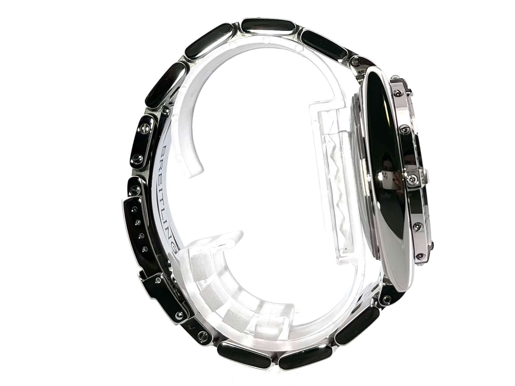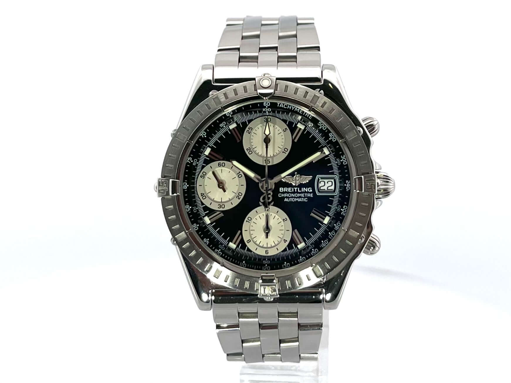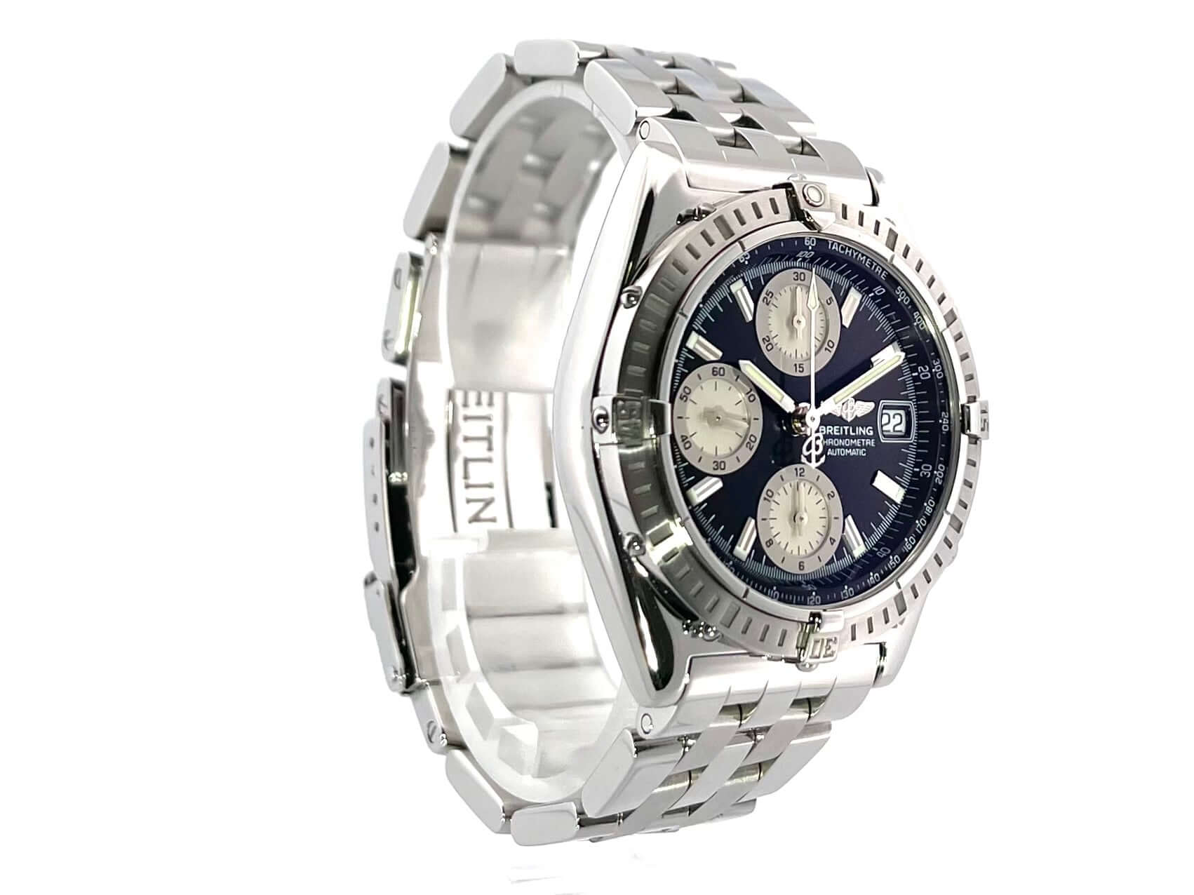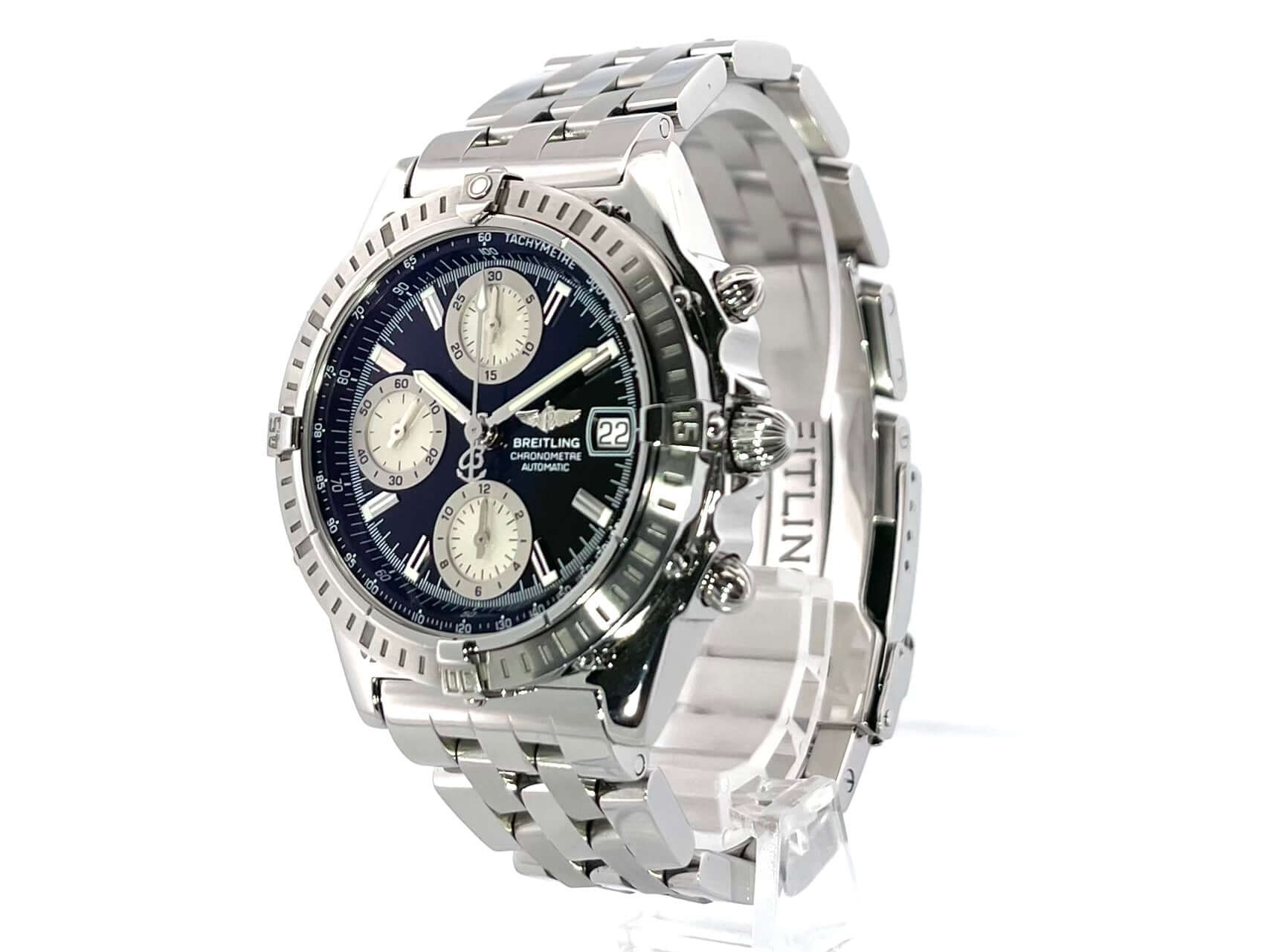 Gehäuse aus Edelstahl satiniert, Gehäusedurchmesser 39 mm, Gehäusehöhe 14,5 mm, Edelstahl Lünette satiniert, Edelstahlband mit Faltschließe, schwarzes Zifferblatt mit Leuchtindizes, Leuchtzeiger, Automatikwerk, Breitling 13, 28.800 A/h, Gangreserve ca. 42 Stunden, Datumsanzeige, Chronometer, Chronograph, Saphirglas, Edelstahlboden verschraubt und graviert, wasserdicht bis zu 10 bar,