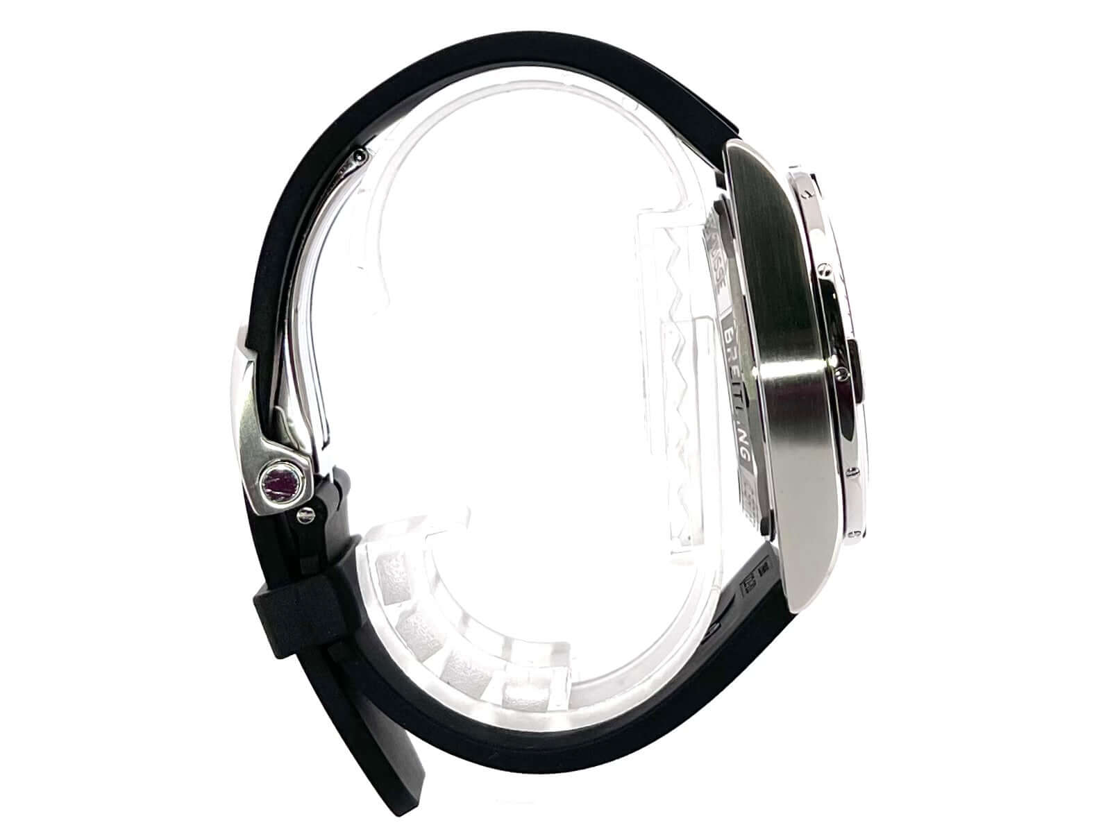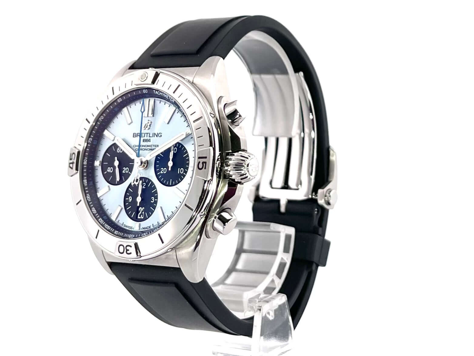 Gehäuse aus Edelstahl poliert und satiniert, Gehäusedurchmesser 42 mm, Gehäusehöhe 15,10 mm, polierte Platin Lünette einseitig drehbar, schwarzes Kautschukband mit Faltschließe, hellblaues Zifferblatt mit Leuchtindizes, Leuchtzeiger, schwarze Totalisatoren, Automatikwerk, Manufakturkaliber Breitling 01 mit 47 Steine, 28.800 A/h, Gangreserve ca. 70 Stunden, Datumsanzeige, Chronograph, Chronometer, Saphirglas doppelseitig entspiegelt, Edelstahlboden mit Sichtfenster, Wasserdicht bis zu 20 bar.