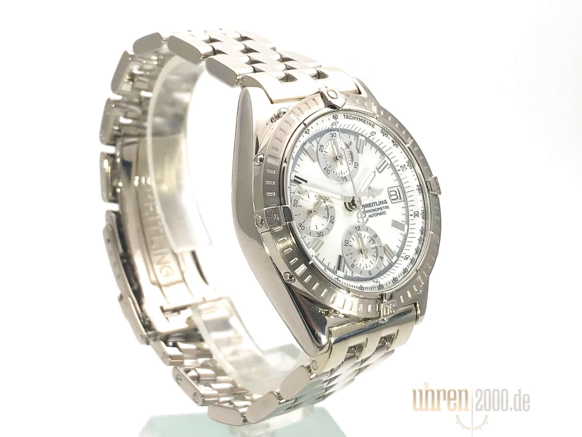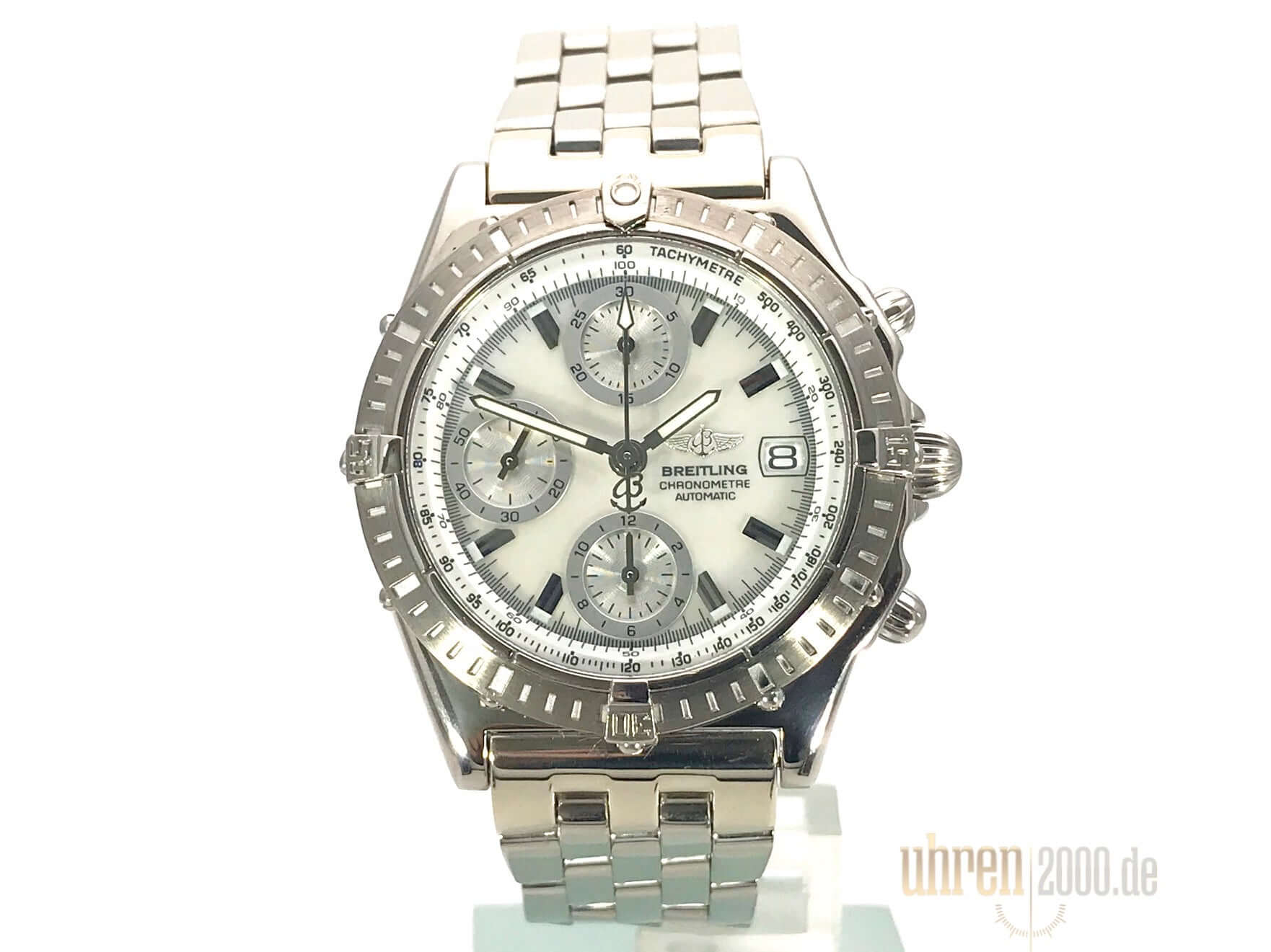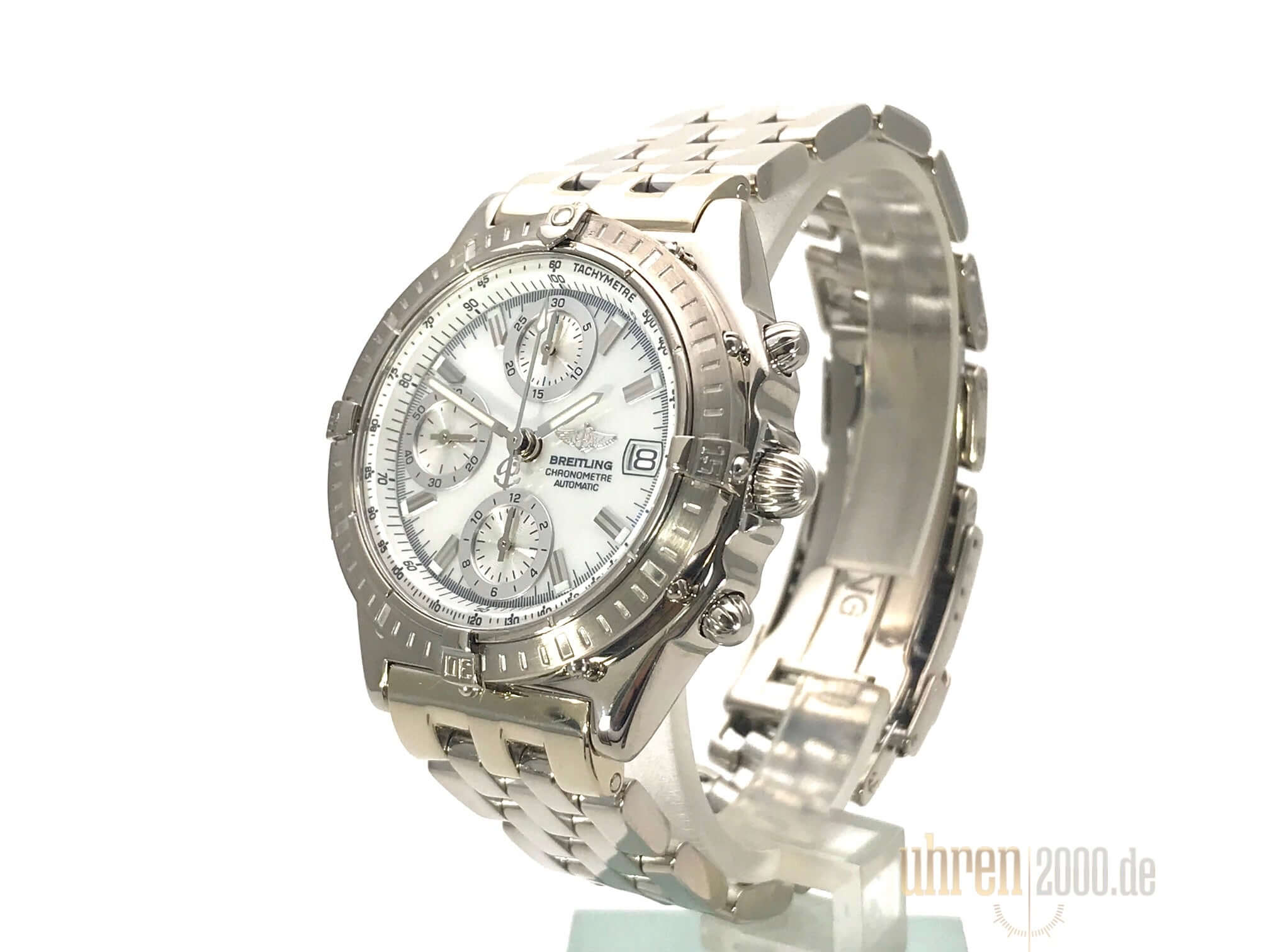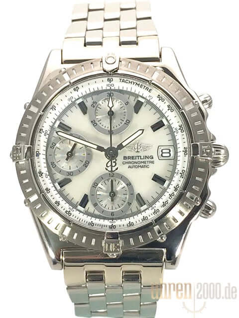 Gehäuse aus Weißgold poliert und satiniert, Gehäusedurchmesser 40 mm, Gehäusehöhe 14,5 mm, Weißgold Lünette einseitig drehbar, Weißgold Armband poliert mit Sicherheitsfaltschließe, Perlmutt Zifferblatt mit aufgesetzten Leuchtindizes und Leuchtzeiger, Totalisatoren silberfarben, Automatikwerk, Chronograph, Chronometer, Breitling 13 mit 25 Steine, 28.800 A/h, Gangreserve ca. 42 Stunden, Datumsanzeige, Saphirglas doppelseitig entspiegelt, Weißgoldboden verschraubt und graviert, Wasserdicht bis zu 10 bar.