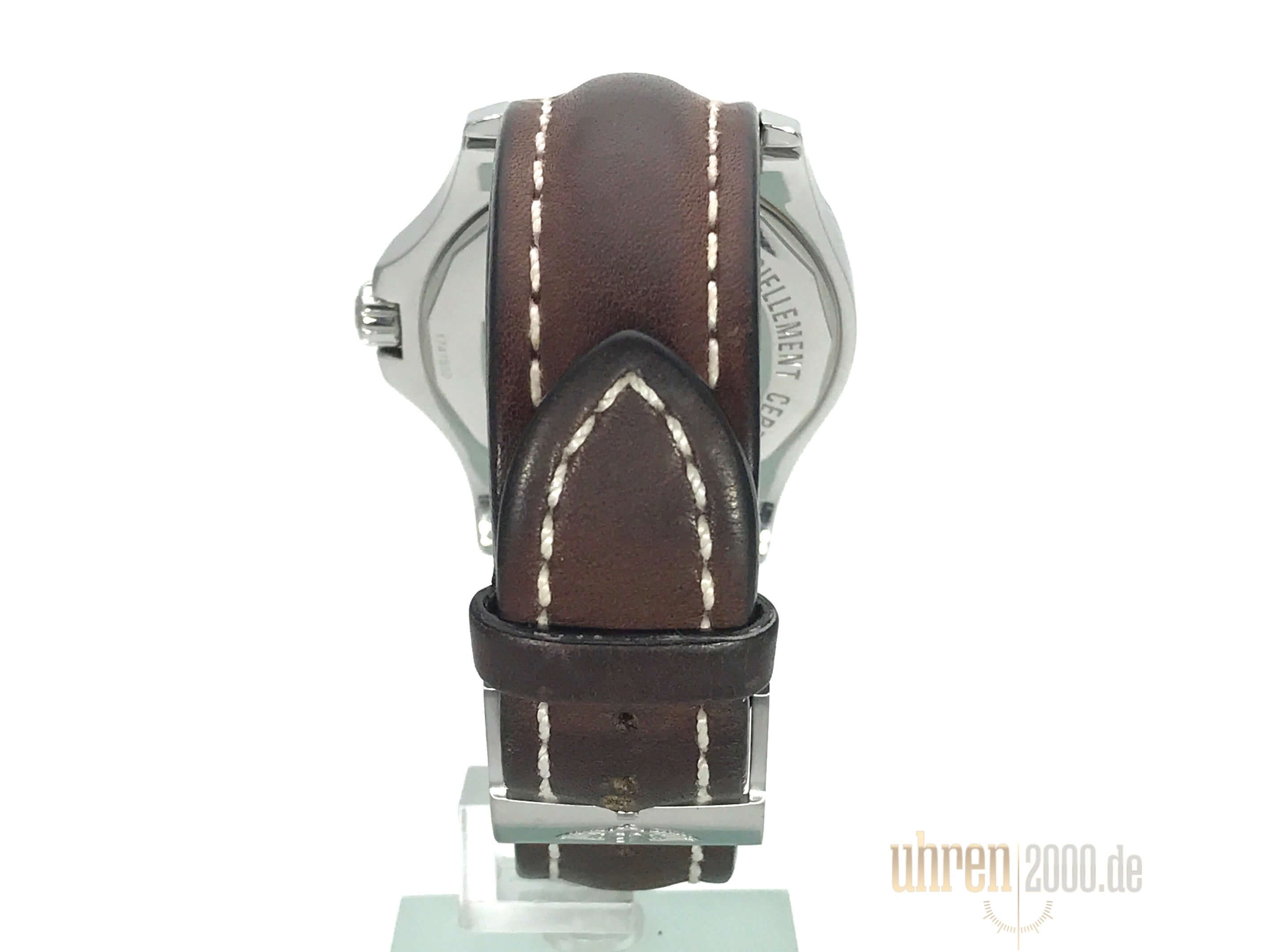Gehäuse Edelstahl poliert und satiniert, Gehäusedurchmesser 44 mm, Gehäusehöhe 11,25 mm, Edelstahl Lünette mit 60 Minuten Skala, einseitig drehbar mit Sperre, braunes Lederband mit Dornschließe, schwarzes Zifferblatt mit aufgesetzten Leuchtindexen, Leuchtzeiger, Uhrwerk Automatik, Chronometer mit Zeugnis, Kaliber Breitling 17, 25 Steine, 28.800 A/h, Gangreserve ca. 40 Stunden, Datum, Saphirglas beidseitig entspiegelt, Krone verschraubbar mit Flankenschutz, Edelstahlboden verschraubt, Wasserdicht bis zu 20 bar.
