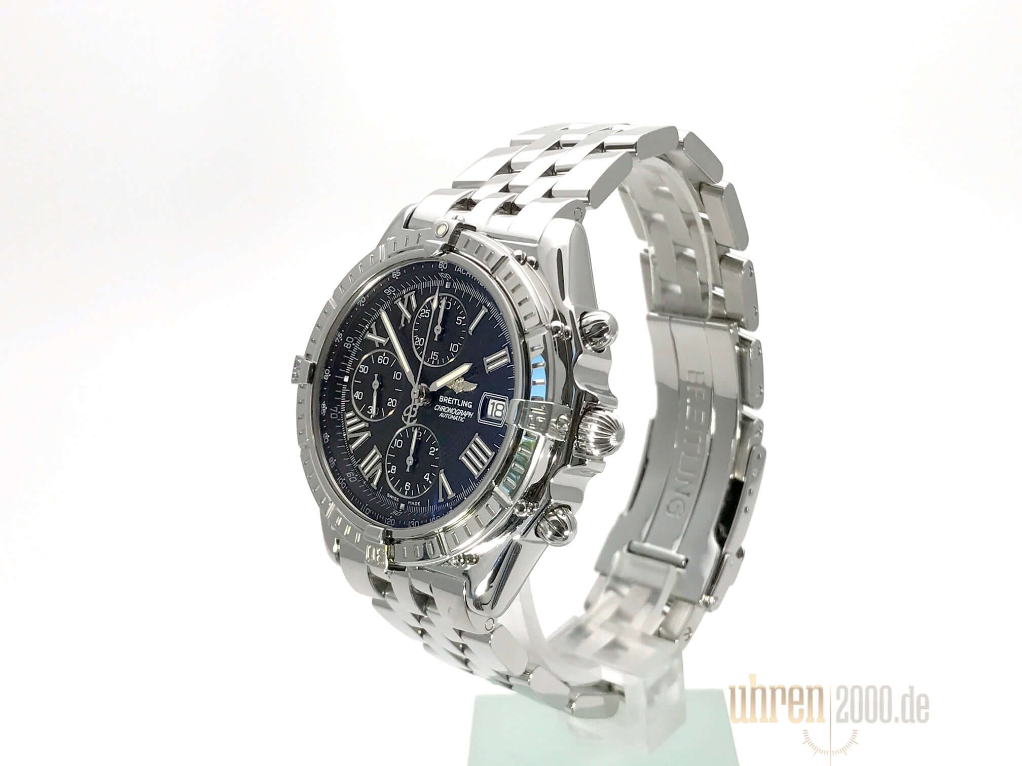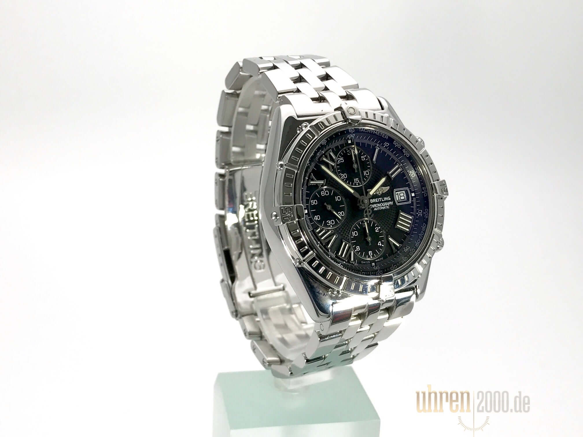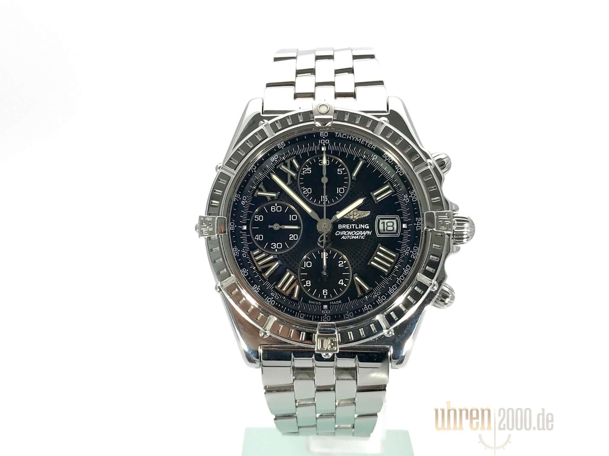 Gehäuse aus Edelstahl poliert, Gehäusedurchmesser 42,7 mm, Gehäusehöhe 15,3 mm, Edelstahl Lünette poliert, Edelstahlband mit Faltschließe, schwarzes Zifferblatt mit aufgesetzten römischen Ziffern, Leuchtzeiger, Automatikwerk, Chronometer, Chronograph, Breitling 13, 28.800 A/h, Gangreserve ca. 42 Stunden, Datumsanzeige, Saphirglas, Edelstahlboden verschraubt und graviert, Wasserdicht bis zu 10 bar.