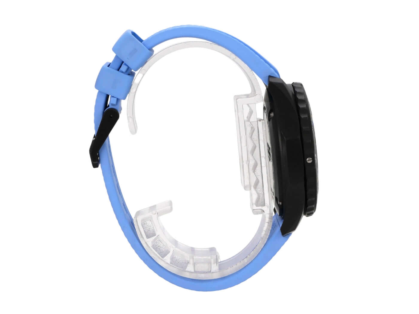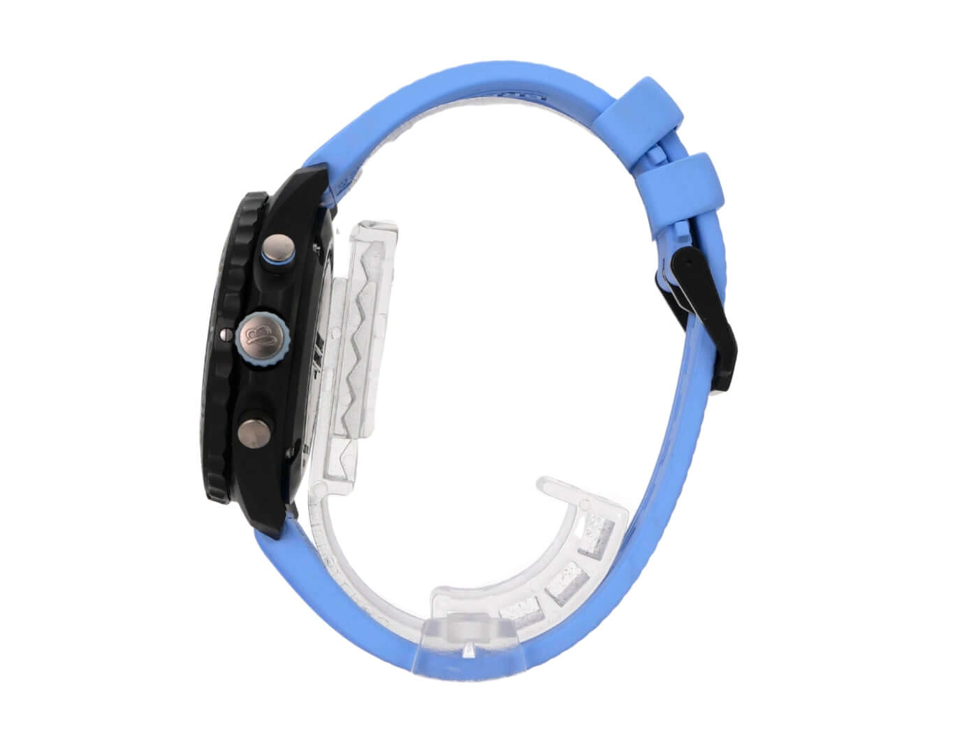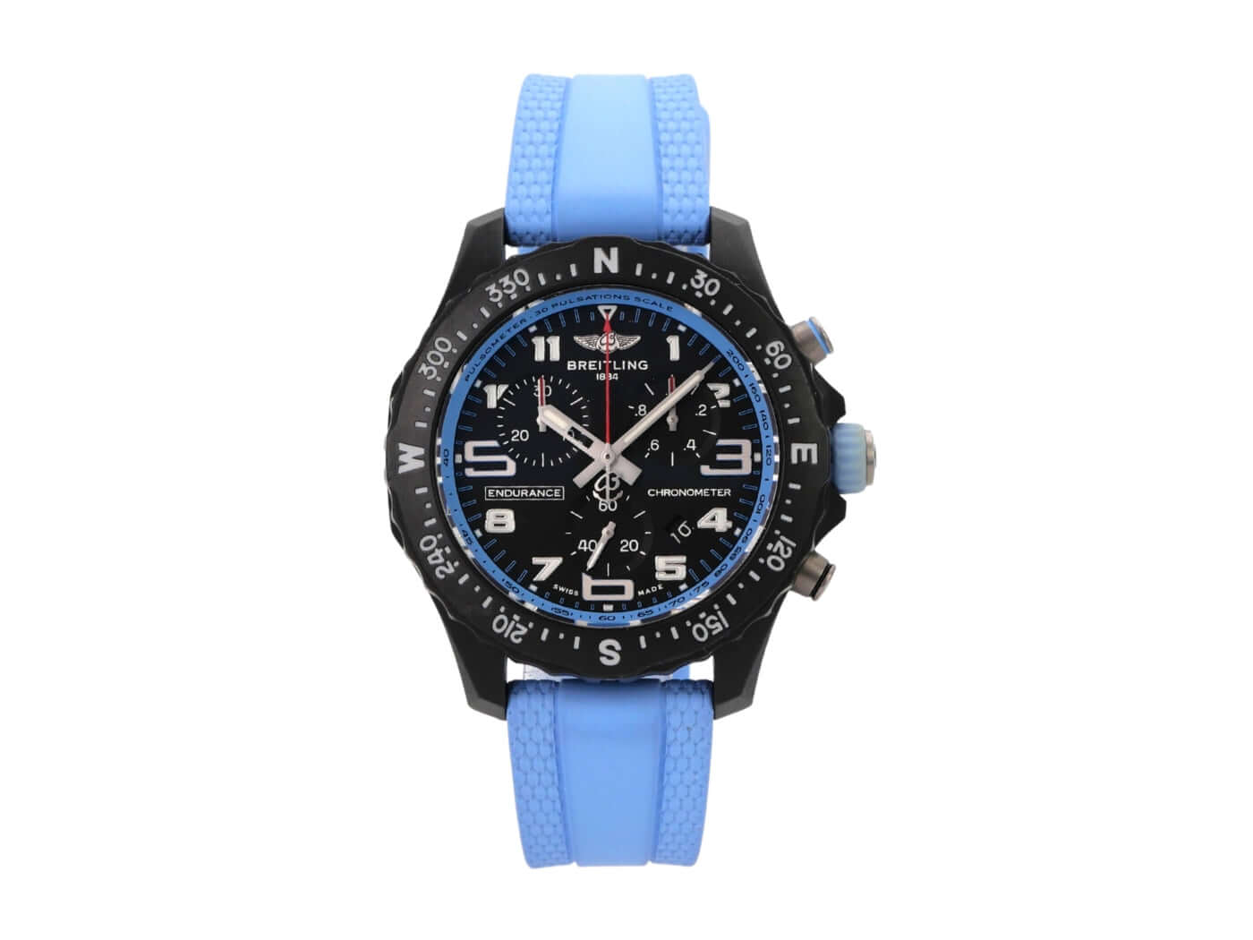 Gehäuse aus Breitlight, Gehäusedurchmesser 38 mm, Gehäusehöhe 12,1 mm, Breitlight Lünette beidseitig drehbar, blaues Kautschukband mit Dornschließe, schwarzes Zifferblatt mit aufgesetzten Leuchtziffern und Leuchtzeiger, Quarzwerk, Breitling 83, Datumsanzeige, Chronograph, Chronometer, Saphirglas doppelseitig entspiegelt, Breitlight Boden, wasserdicht bis zu 10 bar.