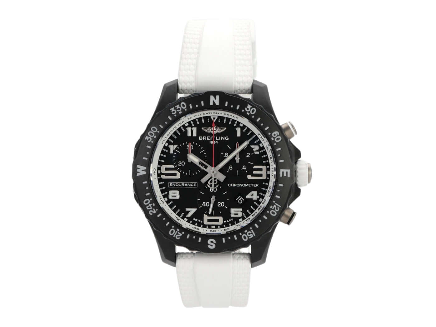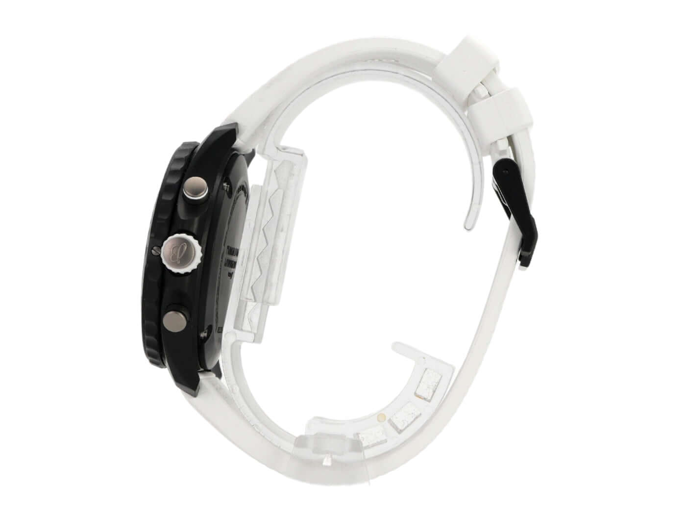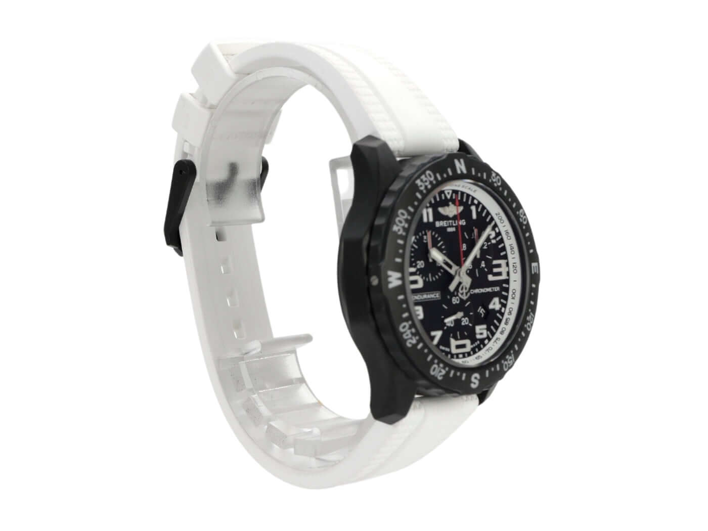 Gehäuse aus Breitlight, Gehäusedurchmesser 38 mm, Gehäusehöhe 12,1 mm, Breitlight Lünette beidseitig drehbar, weißes Kautschukband mit Dornschließe, schwarzes Zifferblatt mit aufgesetzten Leuchtziffern und Leuchtzeiger, Quarzwerk, Breitling 83, Datumsanzeige, Chronograph, Chronometer, Saphirglas doppelseitig entspiegelt, Breitlight Boden, wasserdicht bis zu 10 bar.