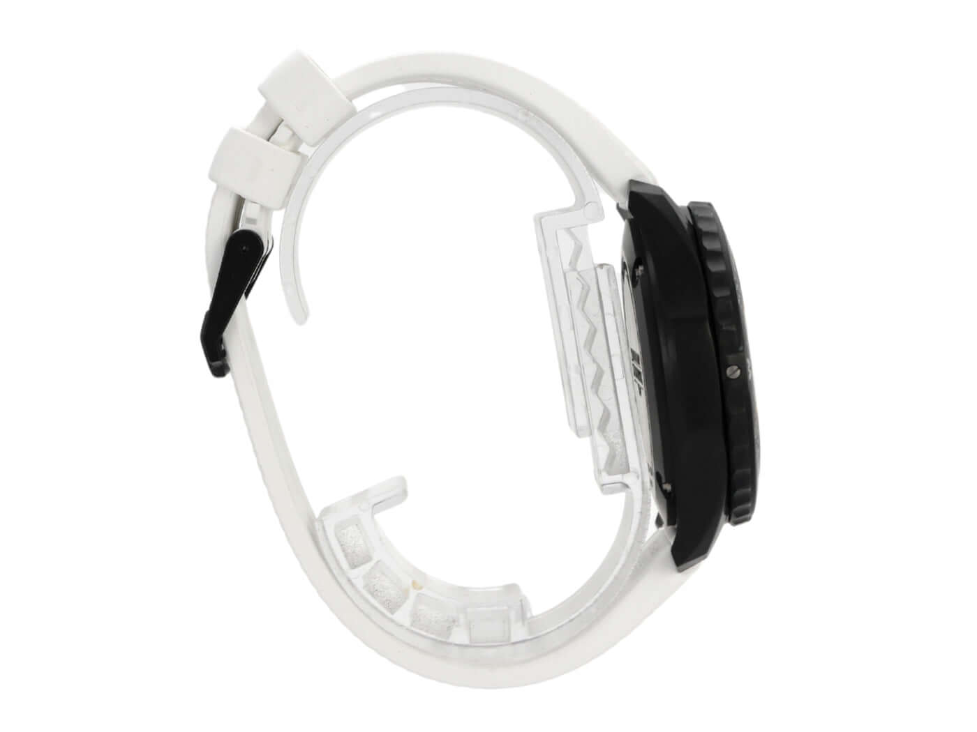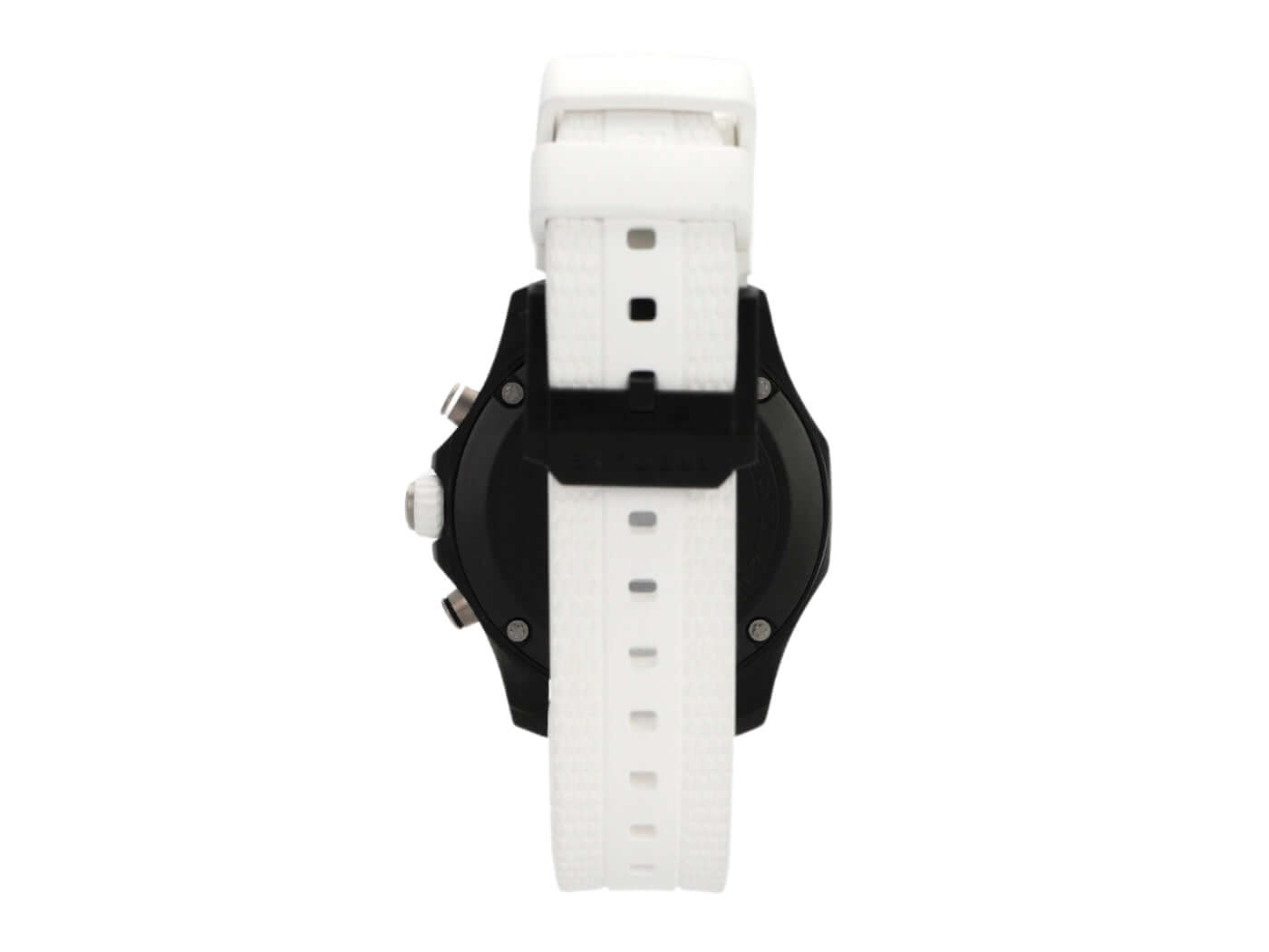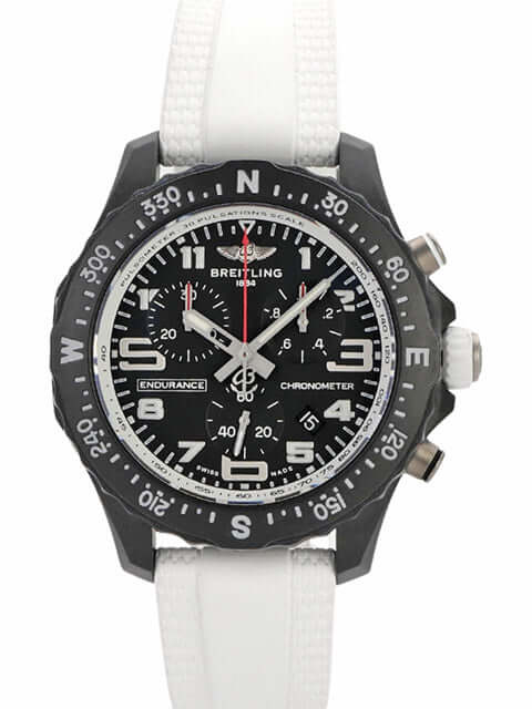 Gehäuse aus Breitlight, Gehäusedurchmesser 38 mm, Gehäusehöhe 12,1 mm, Breitlight Lünette beidseitig drehbar, weißes Kautschukband mit Dornschließe, schwarzes Zifferblatt mit aufgesetzten Leuchtziffern und Leuchtzeiger, Quarzwerk, Breitling 83, Datumsanzeige, Chronograph, Chronometer, Saphirglas doppelseitig entspiegelt, Breitlight Boden, wasserdicht bis zu 10 bar.